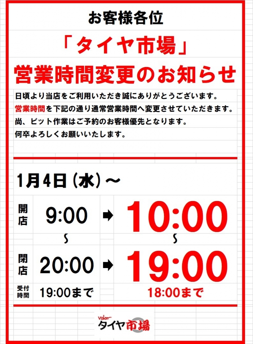 本日1月4日より「タイヤ市場」の営業時間が通常営業時間に戻ります!