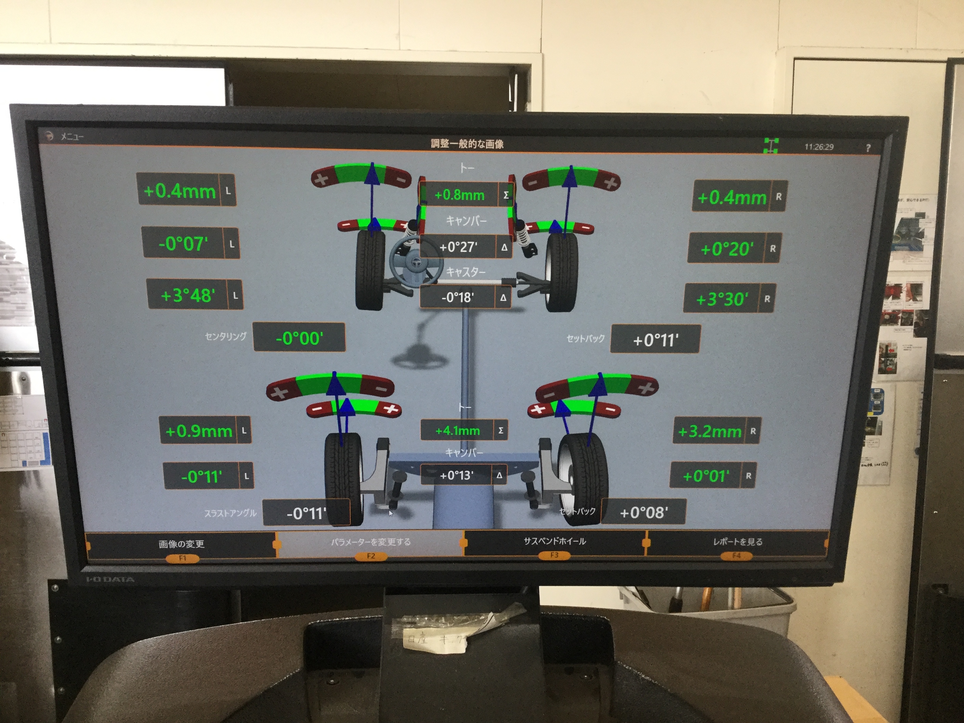 今回は、右側のフロントトー角が右側を向いていて、右タイヤが車両外側に大きくズレている状態でした!!