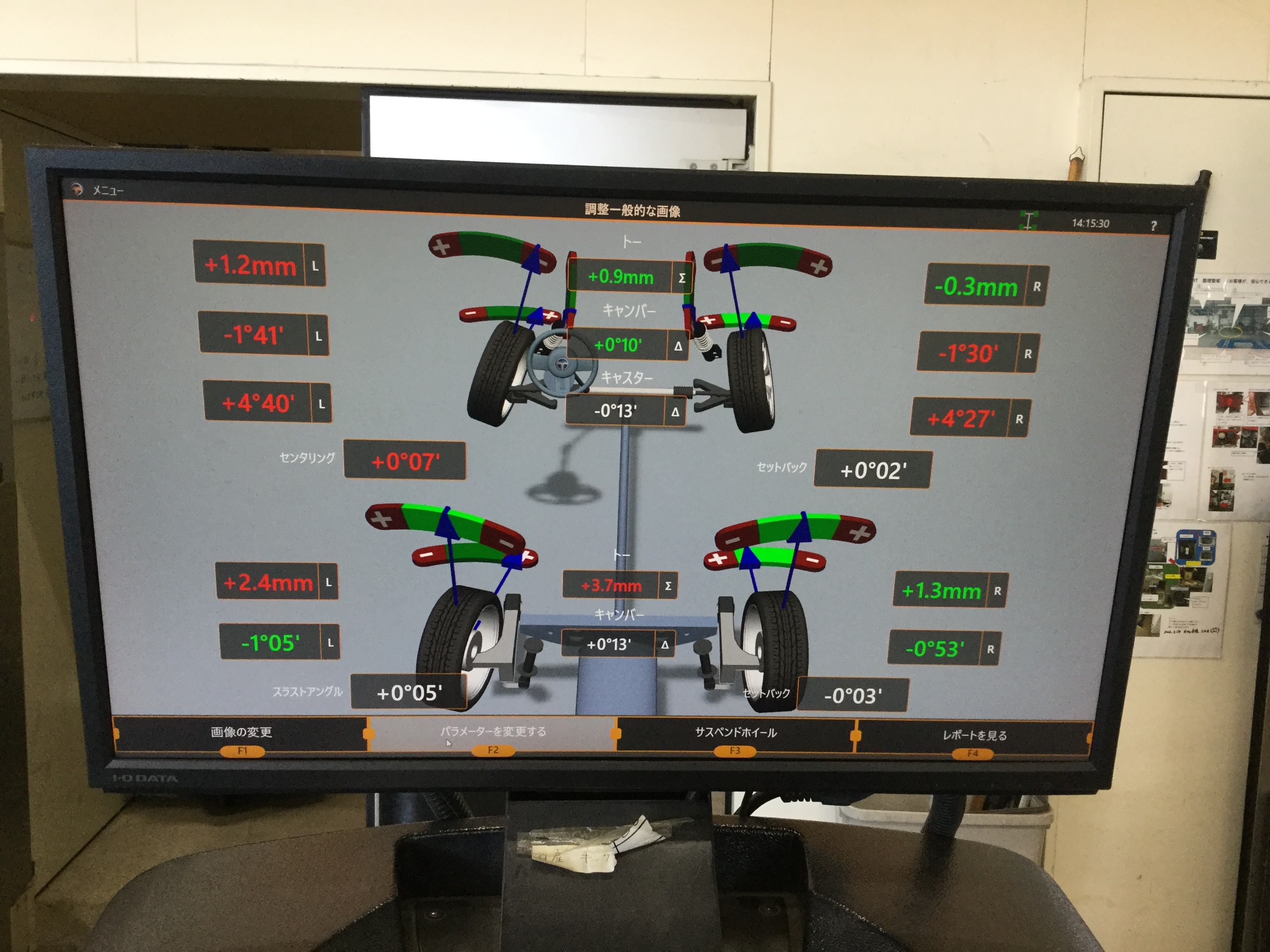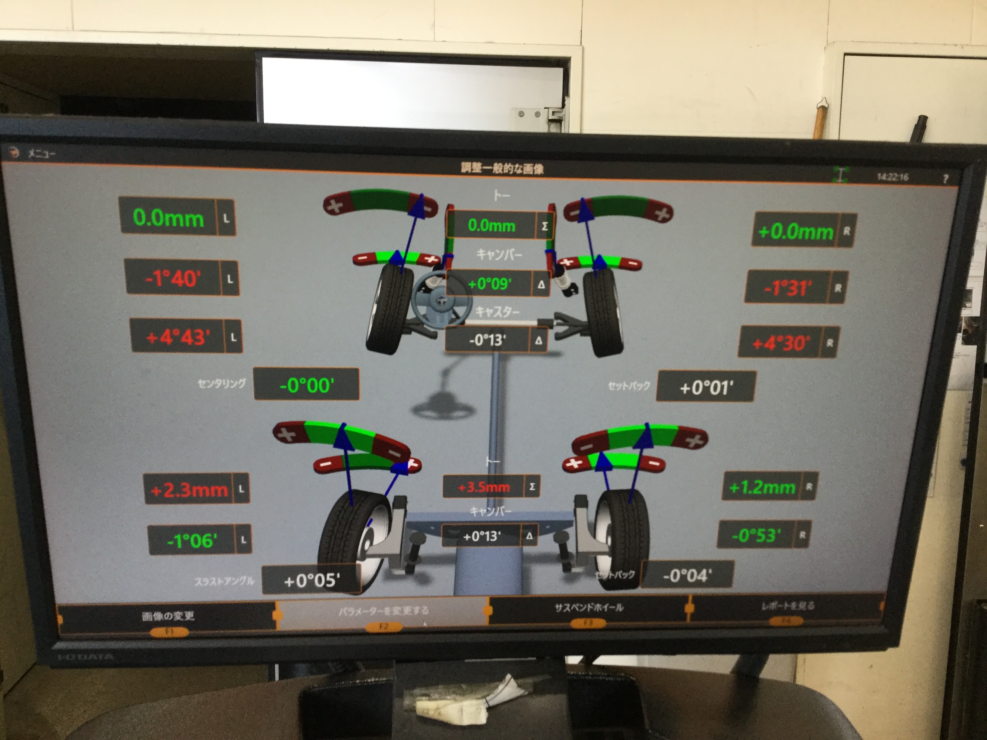今回は、左側のフロントトー角とリアのトー角が大きく右側を向いていて、左タイヤが車両内側に大きくズレている状態でした!!