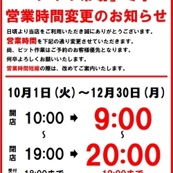 AM9:00~PM8:00(ピット作業受付:AM9:00~PM7:00)1月/2月/5月/6月/7月/8月/9月