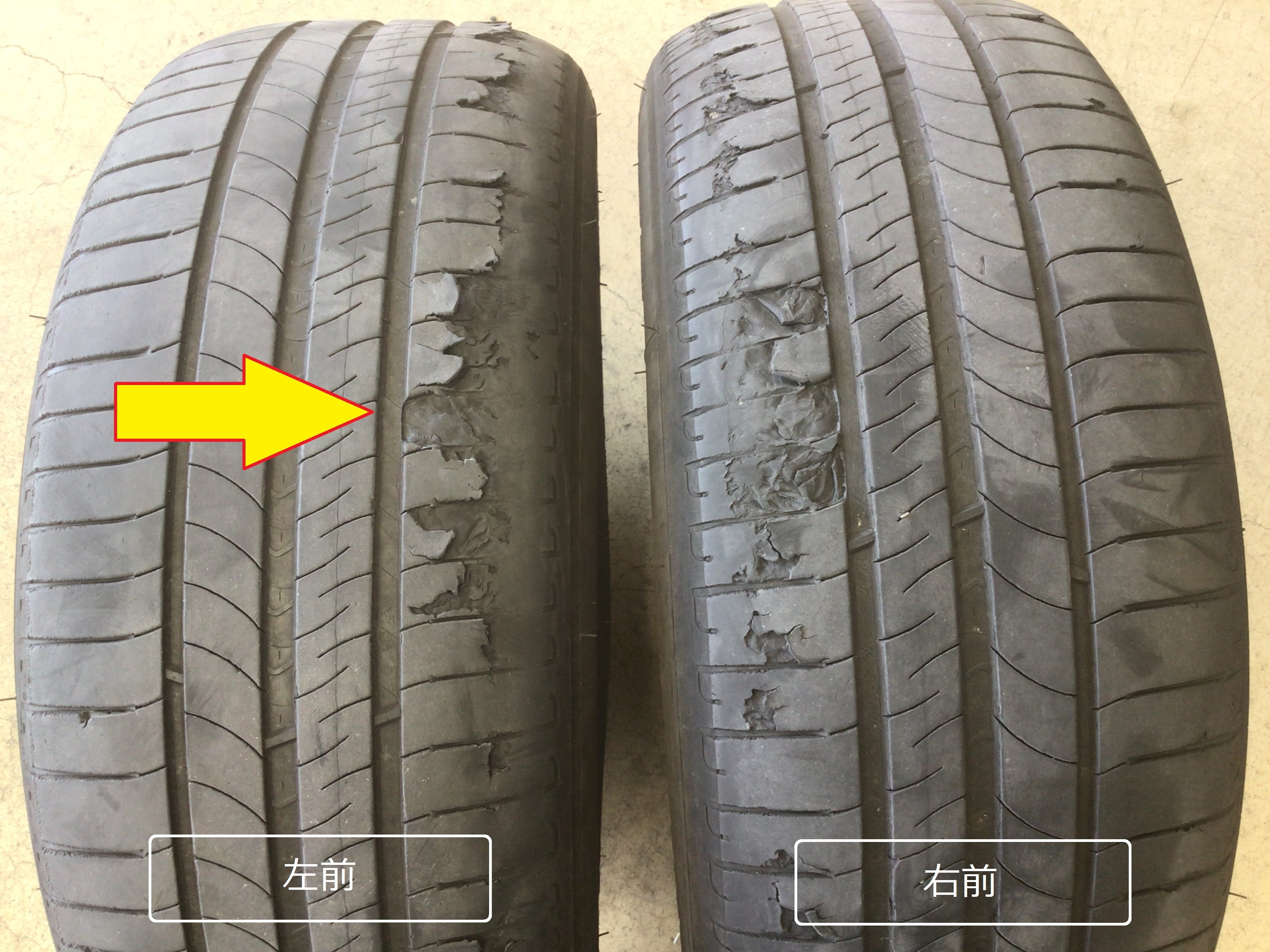 本来タイヤは外側から減っていくことが正常なので、内側がこれだけ削れているということは何かしら異常が起きている