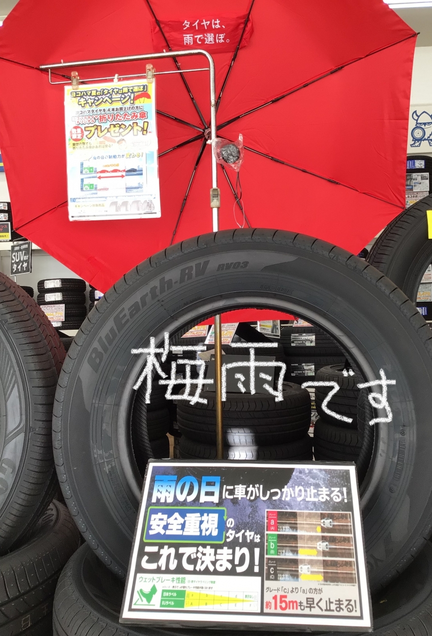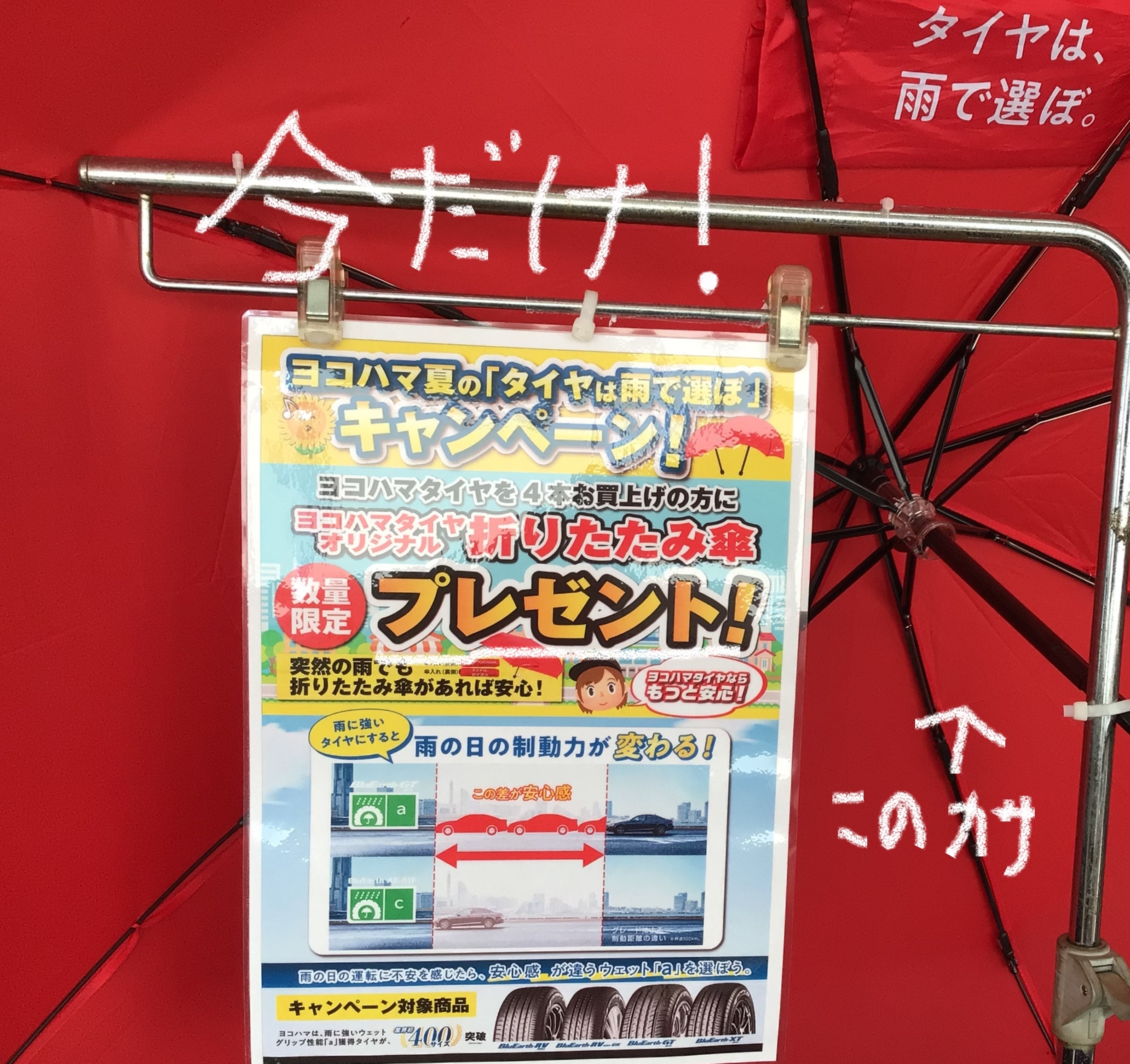 只今ヨコハマタイヤでは、タイヤお買い上げで折りたたみ傘をプレゼント中!