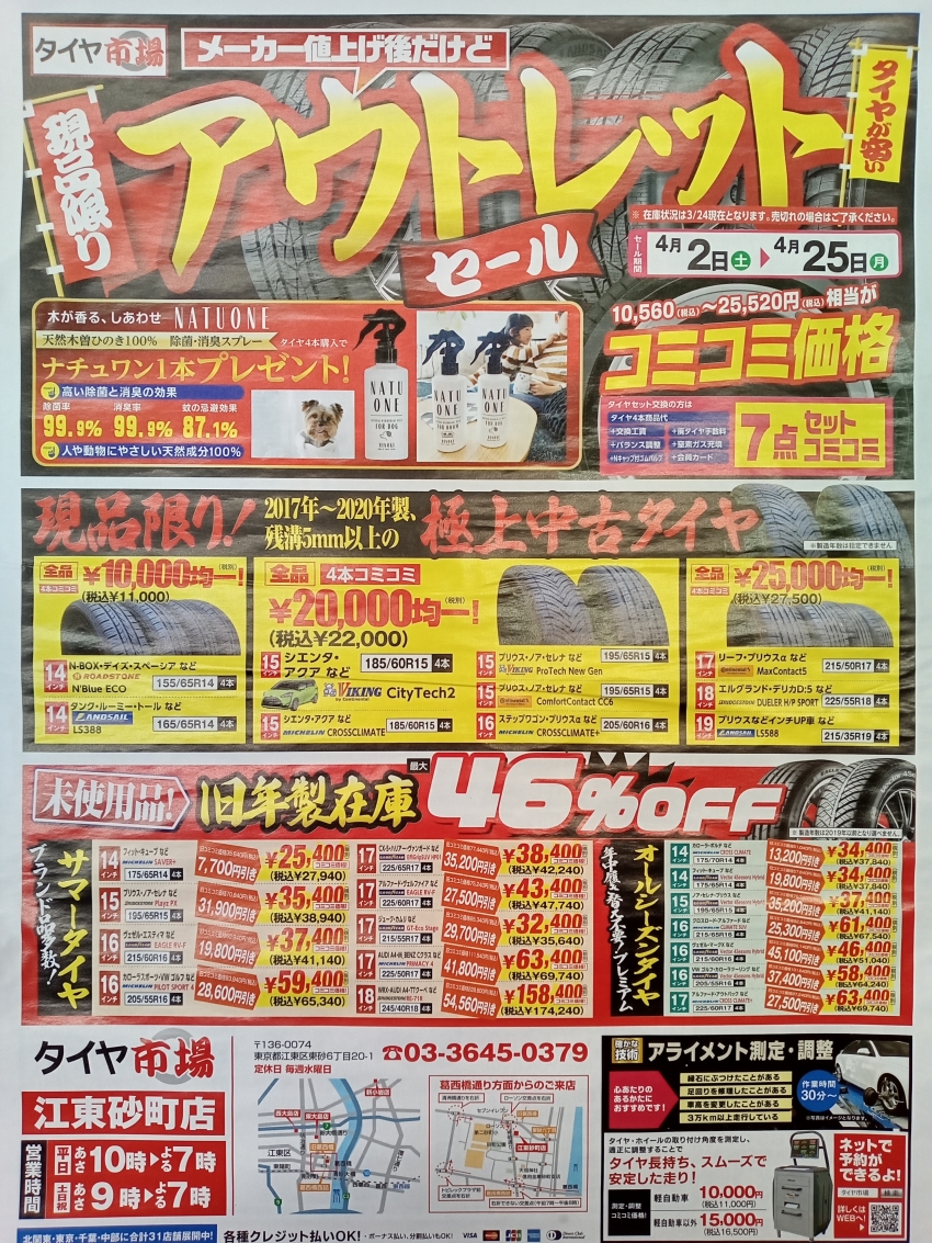 現在、現品限りのタイヤのアウトレットセールを実施しています。