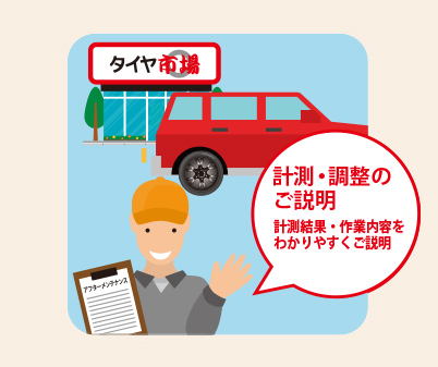 - ①タイヤ・ホイールの取り付け角度を適正に調整する作業。
