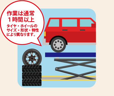 - 通常1時間以上ですが、タイヤ・ホイールのサイズ・特性・状態により異なります。