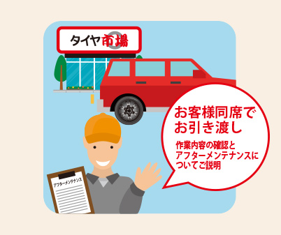 作業完了後は、ご一緒に仕上がりのご確認をいただき、慣らし走行・空気圧の低下・アフターメンテナンスについてご説明いたします。