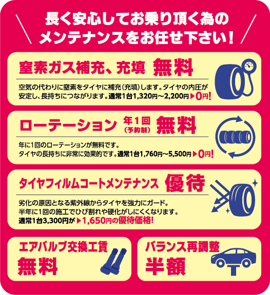 2年または3年間、タイヤに必要なメンテナンスを全てお任せいただける会員制度です。