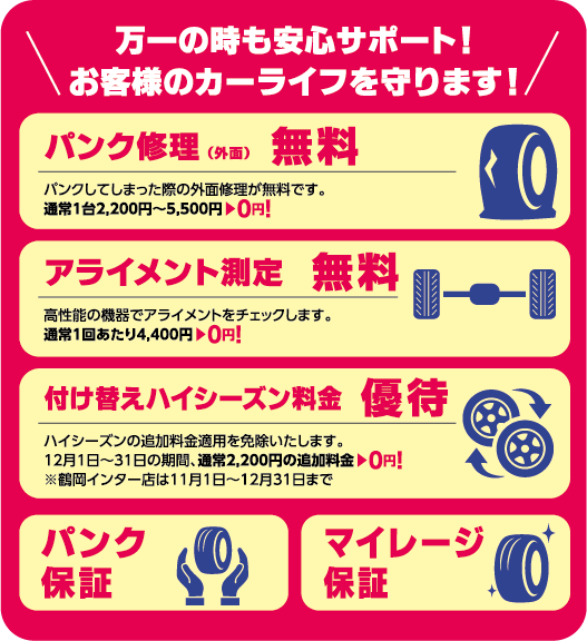 - パンク保証の内容につきましては規約をご確認下さい。2年コースの場合は2年間4本を保証します。(1回まで)