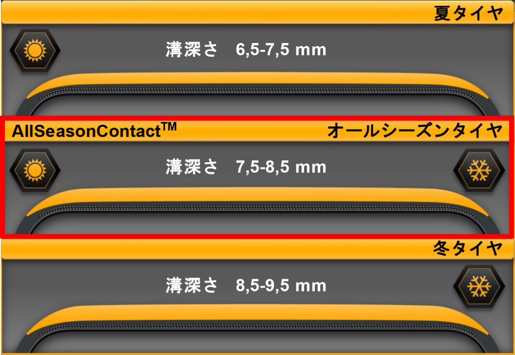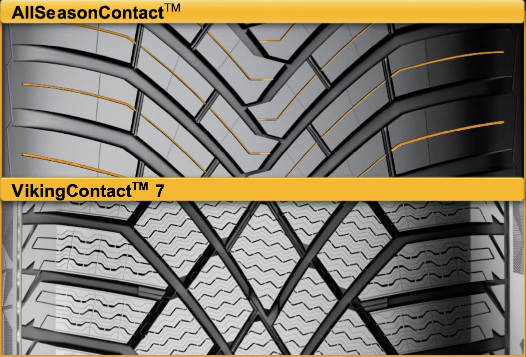 - ウィンター・パフォーマンス・レジンと高充填率のシリカを兼ね備えたトラクション・シリカ・コンパウンド,によって、AllSeasonContactは低温下でも常に柔軟性を保ちます。この路面に対する高い適応性により、雪に覆われた路面や濡 れた冬の路面でも優れたパフォーマンスが発揮されます。