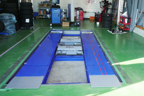 全店舗、埋め込み式リフトを完備。車高の低い車両でも干渉せずリフトアップ。 エアロ装着車も作業可能です。