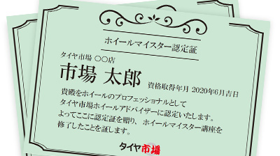 ホイールアドバイザー講習全課程を修了した認定証(タイヤ市場発行)取得済みのホイールのスペシャリスト=ホイールマイスターが対応いたします。