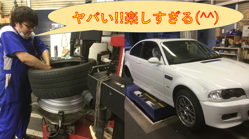 BMWのM3のタイヤ交換作業をしているstaffの様子です(^^♪