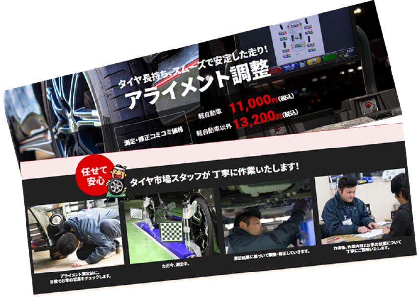 簡単にご説明致しますと、お車の車体に対するタイヤの取付角度の事を言いまして、新車当時は当然適正角度で取り付いておりますが、ある程度の距離を走行しますとどうしても狂いが生じてしまう部分となります( ..)φメモメモ