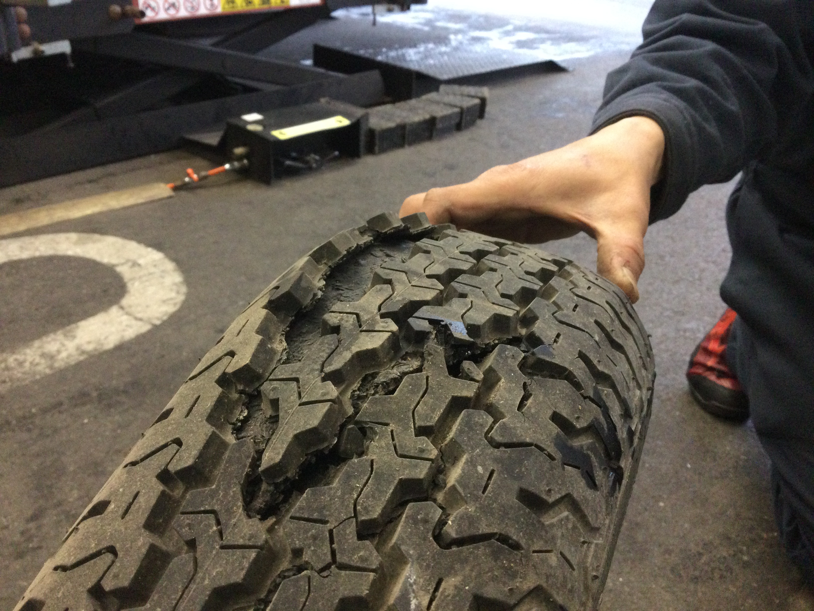 完全にトレッド面が裂けてしまいもう使い物にならなくなってしまっています