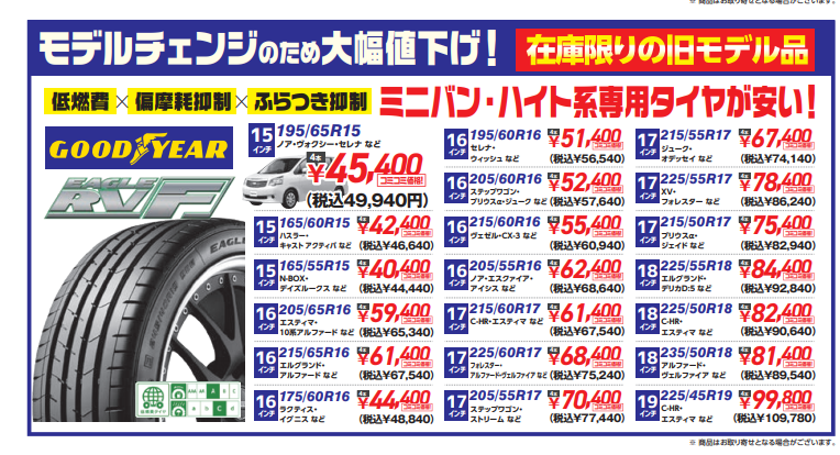 何で安いのかと言いますと、グッドイヤーさんの方で今年新しいモデルのRVF02が発売された事に伴い、旧モデル品という事で皆様にお安くご案内する事が可能となりました!(^^)!