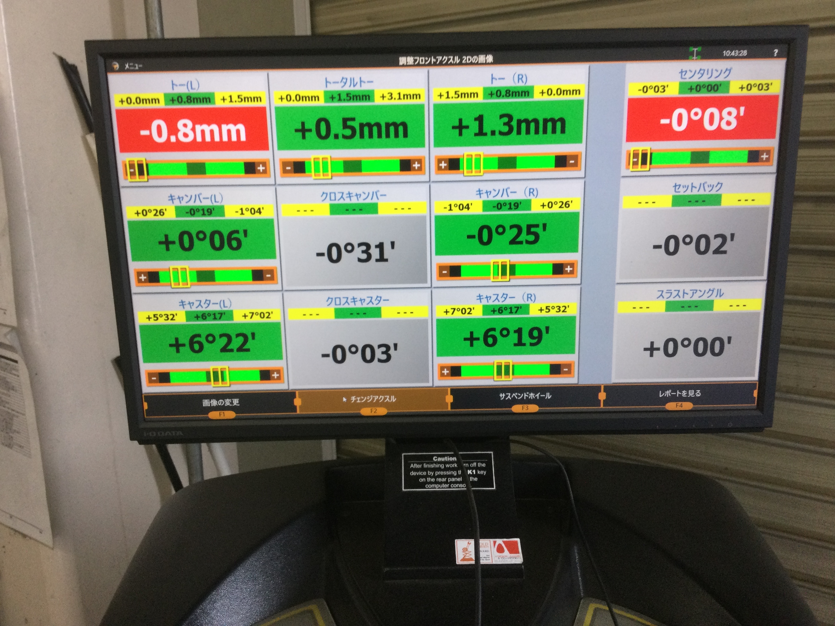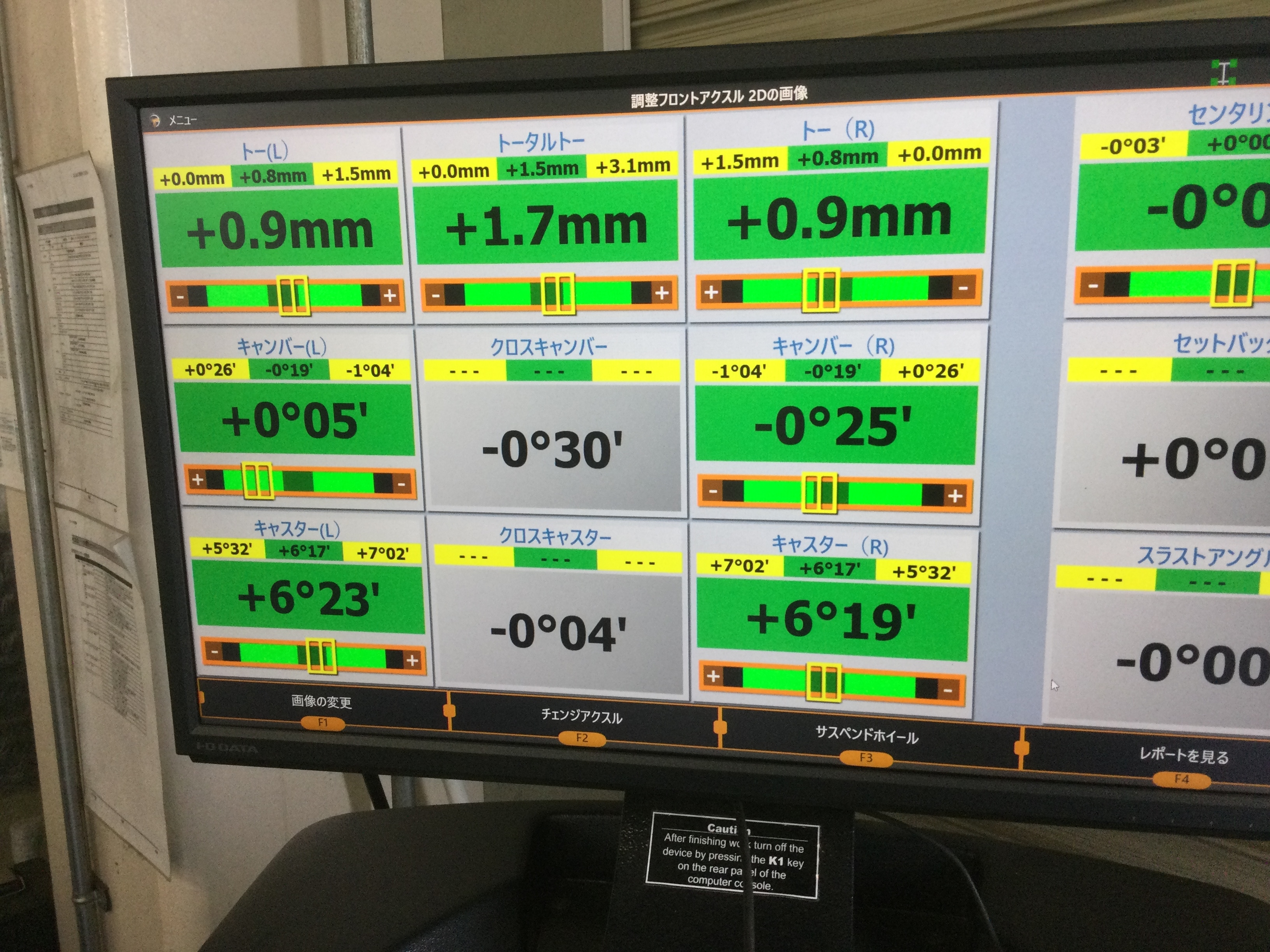 お客様より、前側のタイヤが偏摩耗するという事で作業をお受けさせて頂きましたのですが、先ずは車両をテスターに入れて現状の数値を測定致しました!!