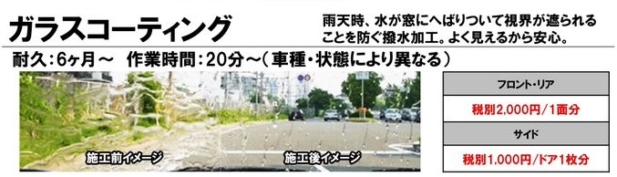 続いて人気がありますのは、フロントガラスの撥水コートです!!雨の日の視界改善に効果ありのオススメのメニューとなります!!特に梅雨の時期は大人気です(^^♪