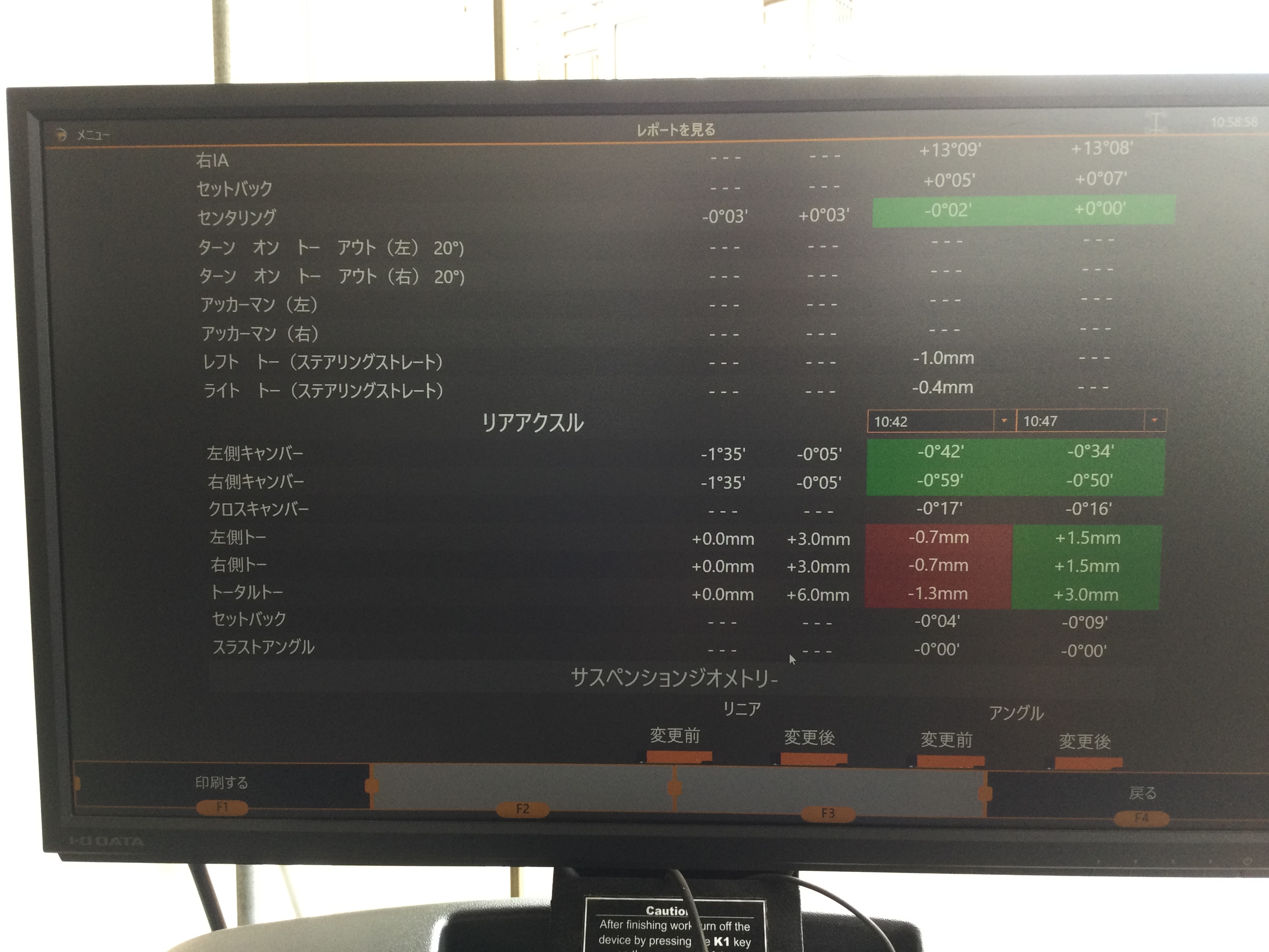 測定させて頂きました結果と致しまして、前側のタイヤは基準値内にありましたが後ろ側のタイヤが左右共に外開きの状態になっていましたので、調整をさせて頂きました!(^^)!