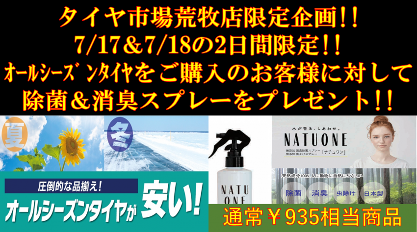 タイヤ市場荒牧店限定企画!! オールシーズンタイヤ購入で除菌&消臭スプレーをプレゼント!!