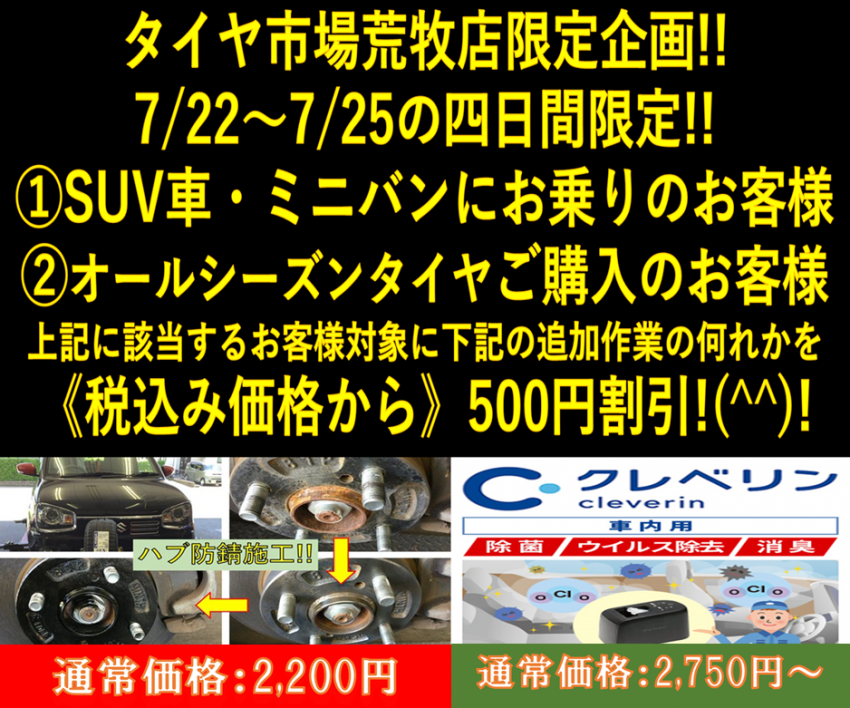 今回の内容と致しましては、夏休みファミリー企画と致しまして、お子様連れでご来店頂いた際には、おもちゃプレゼント!(^^)!&【SUV車・ミニバンにお乗りのお客様でキャンペーン期間中にタイヤ4本ご購入のお客様】+【オールシーズンタイヤご購入のお客様】に対しまして、当店オススメの追加メニュー《ハブ防錆又はクレベリン除菌》の内何れかを追加で作業させて頂きますと通常価格(税込)より、500円割引させて頂きます!(^^)!