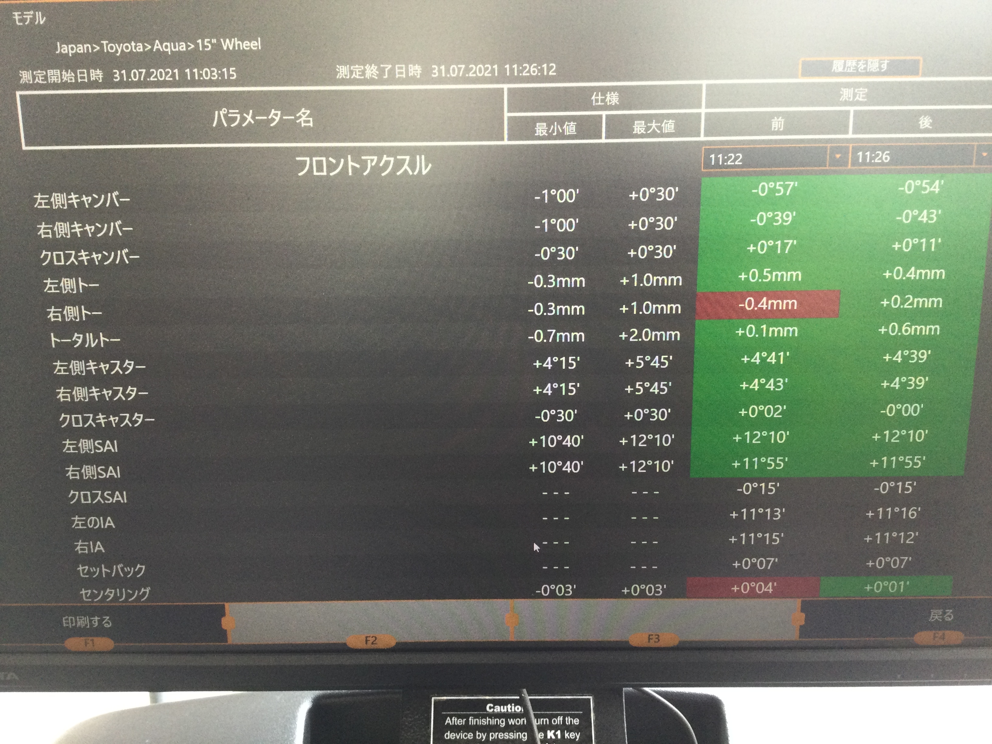 測定機に車両を入れて現状の数値を測定した結果が、こちらになります!!
