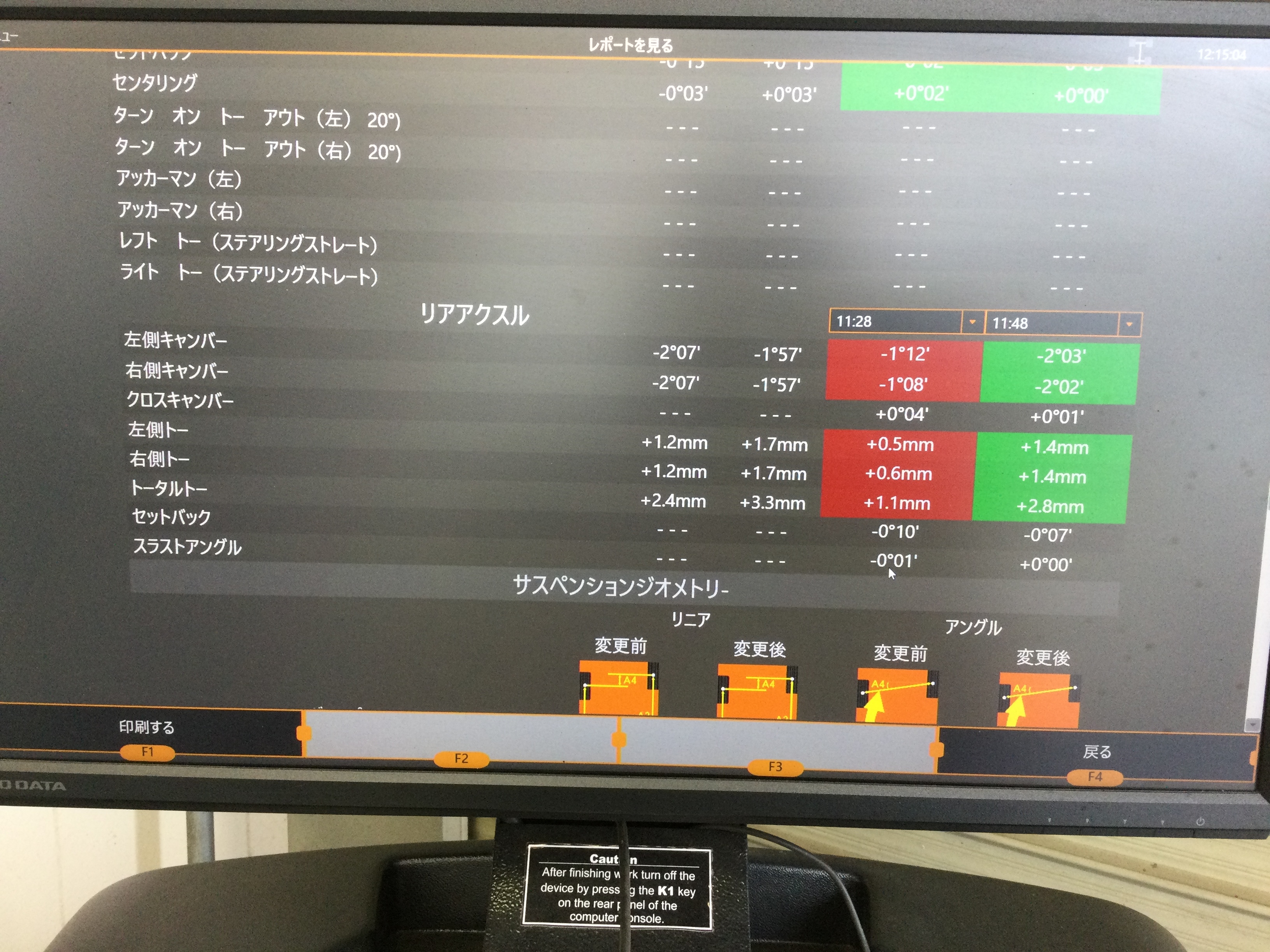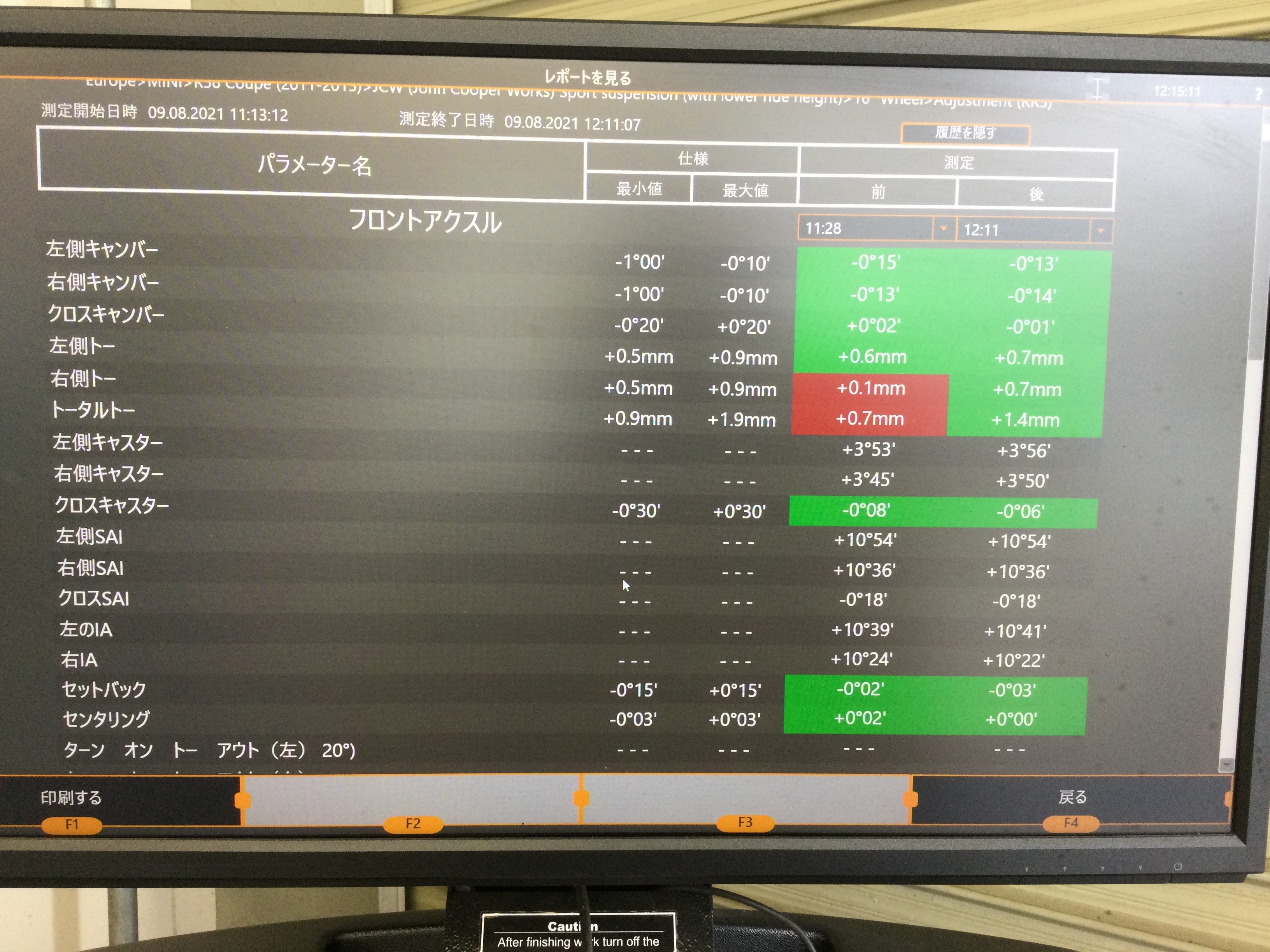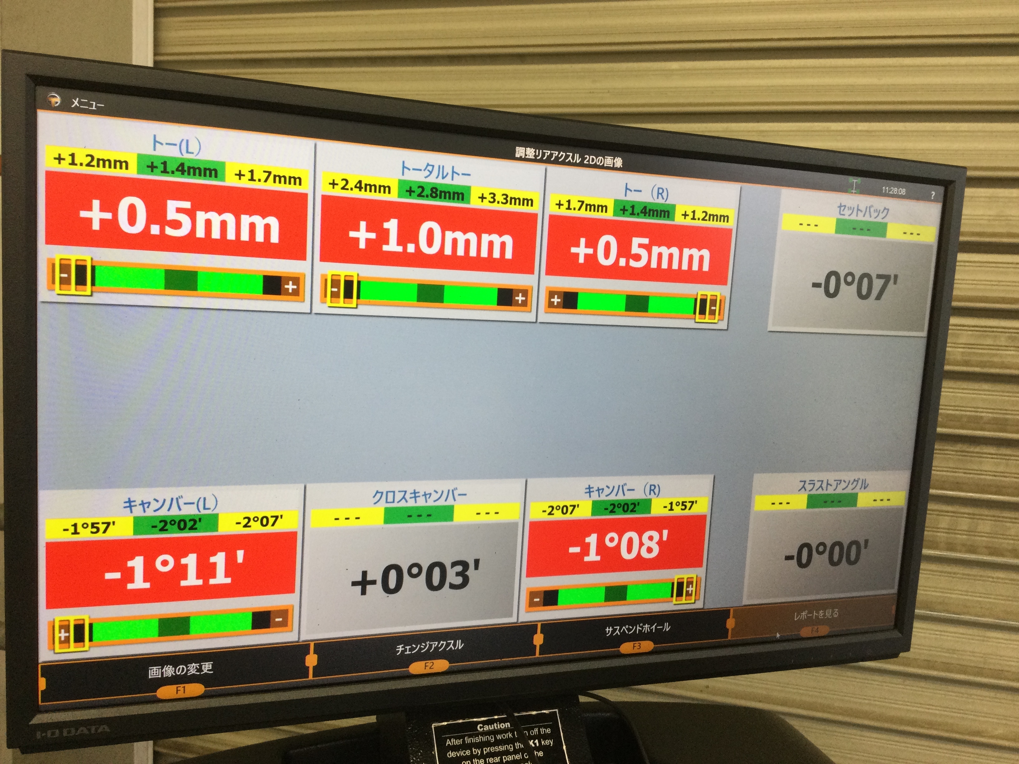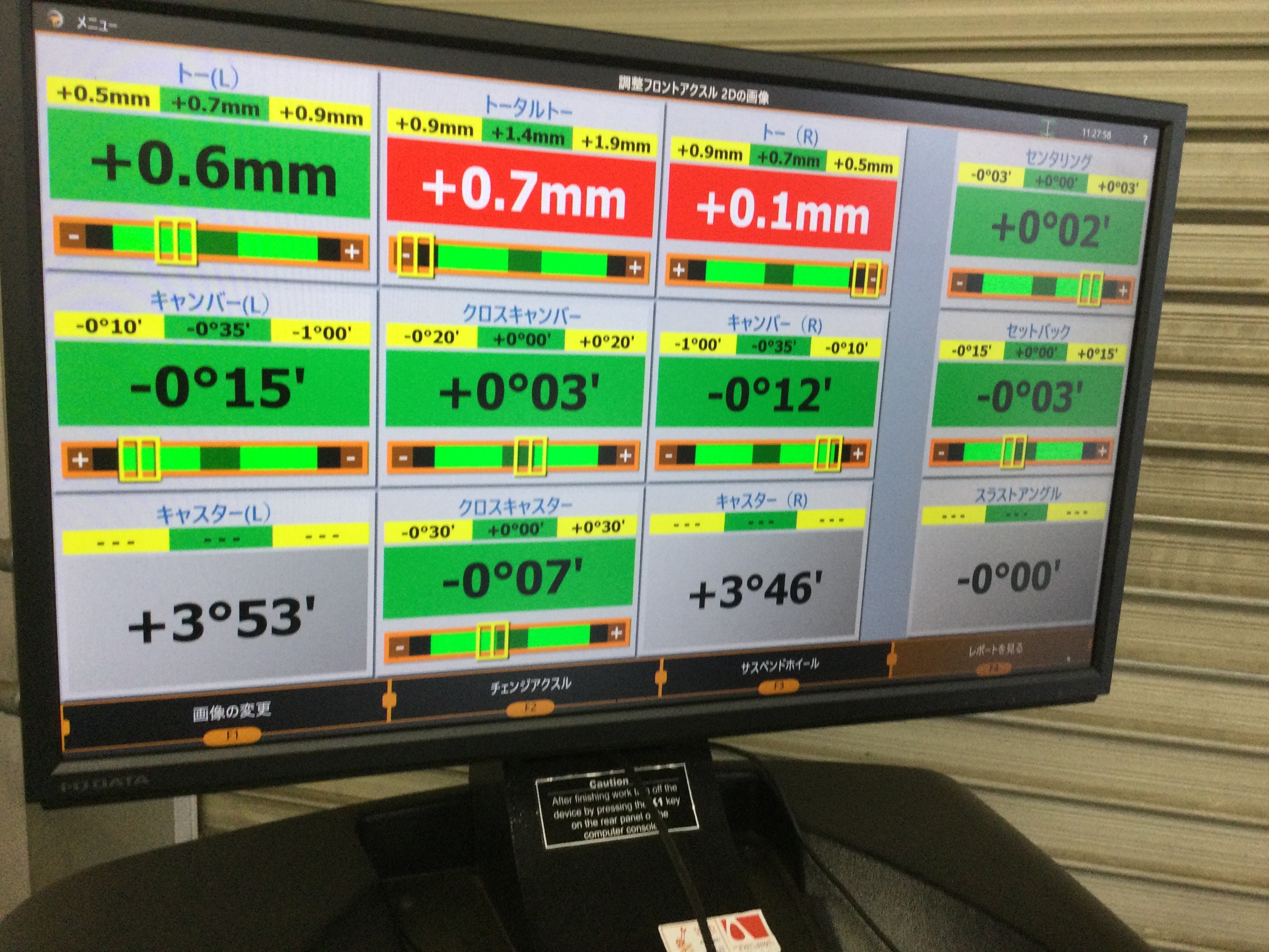 測定の結果と致しましては、前後のタイヤ共にタイヤの取付角度が規定値よりも内側に向いてしまっているような状態でした!(^^)!