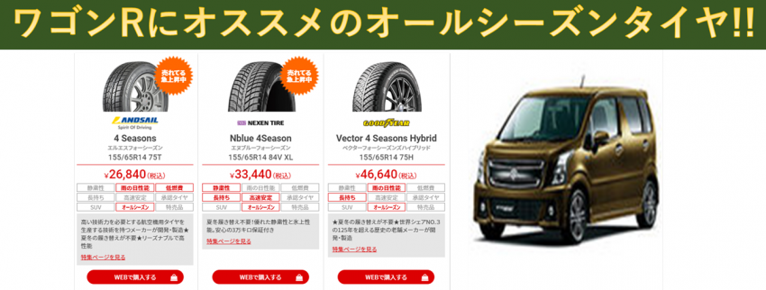 本日は、SUZUKIワゴンRにオススメのオールシーズンタイヤ(155/65R14)をご紹介致します!(^^)!
