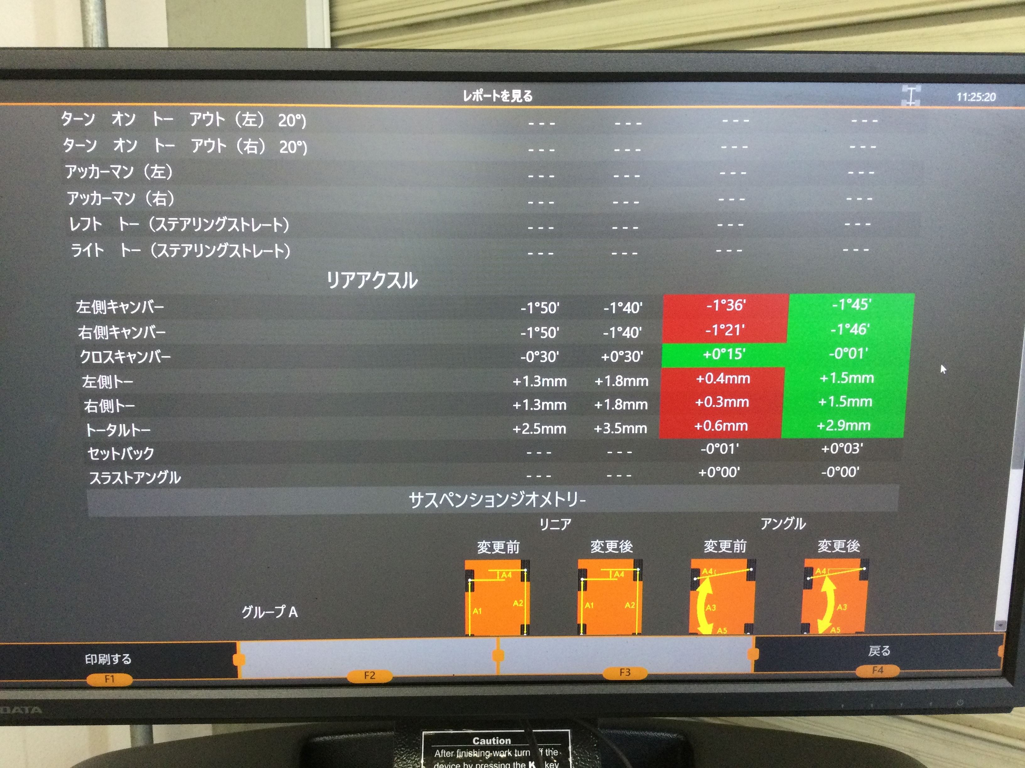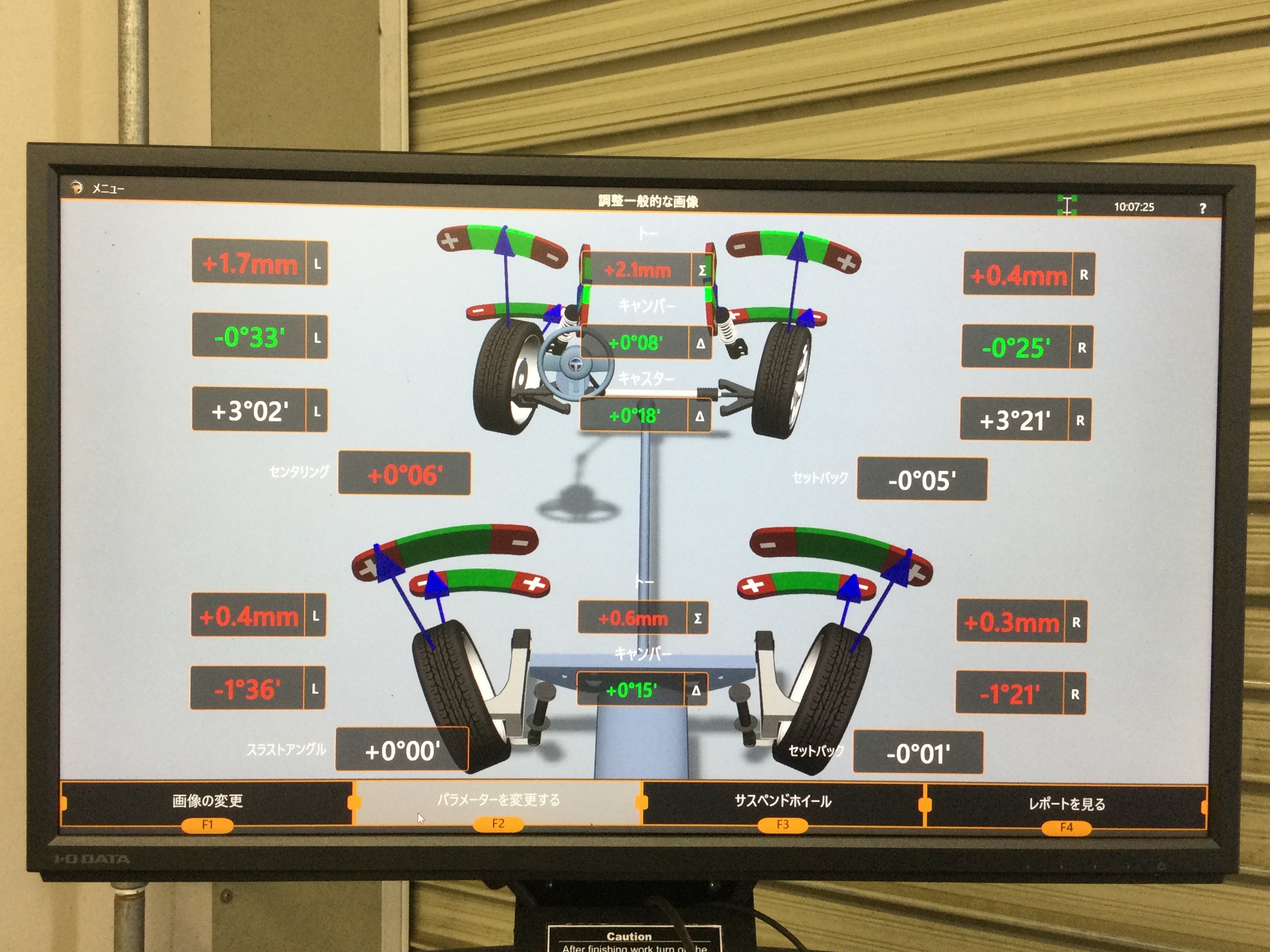 調整前の段階では、前側のタイヤは左右共に右側に向いてしまっており、後ろ側のタイヤは左右共に外開きの状態になっていましたので、当店のstaffにより確りと基準値に調整させて頂きました!(^^)!