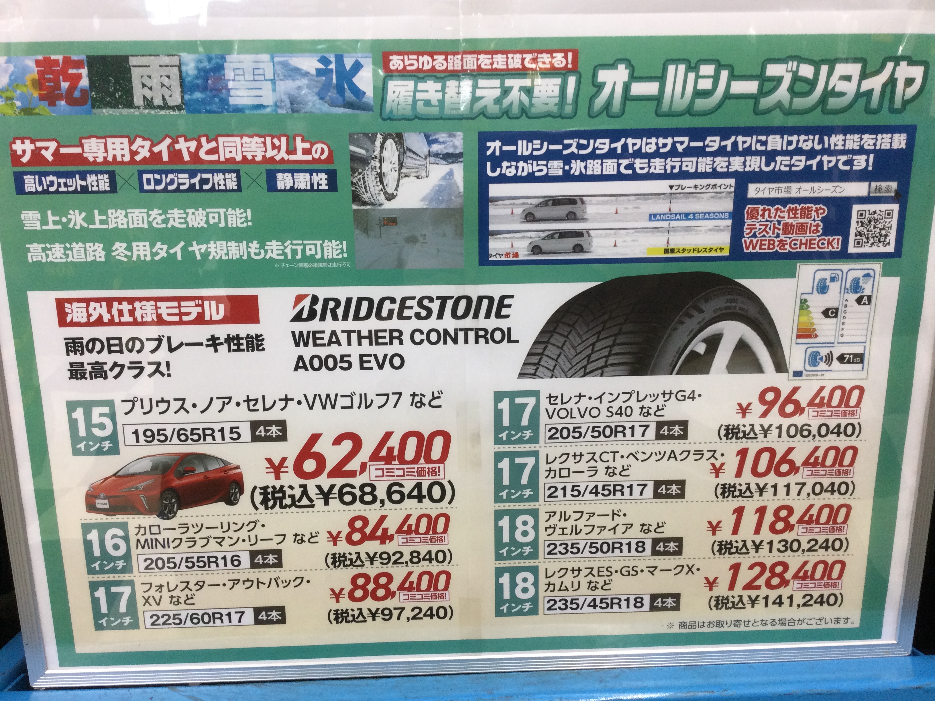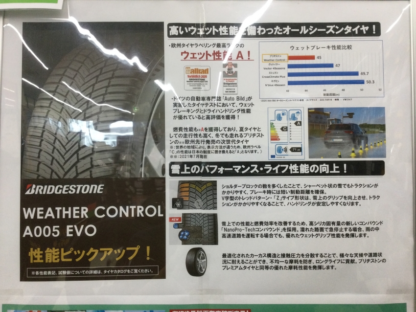 ご紹介したい商品と致しましては、ブリヂストンのウェザーコントロールという商品なのですが、こちらの商品何が凄いのかと言いますと、オールシーズンタイヤなので積雪路面での走行が可能な事は当然なのですが、夏タイヤとしての性能にも一切の妥協がないという点です!!