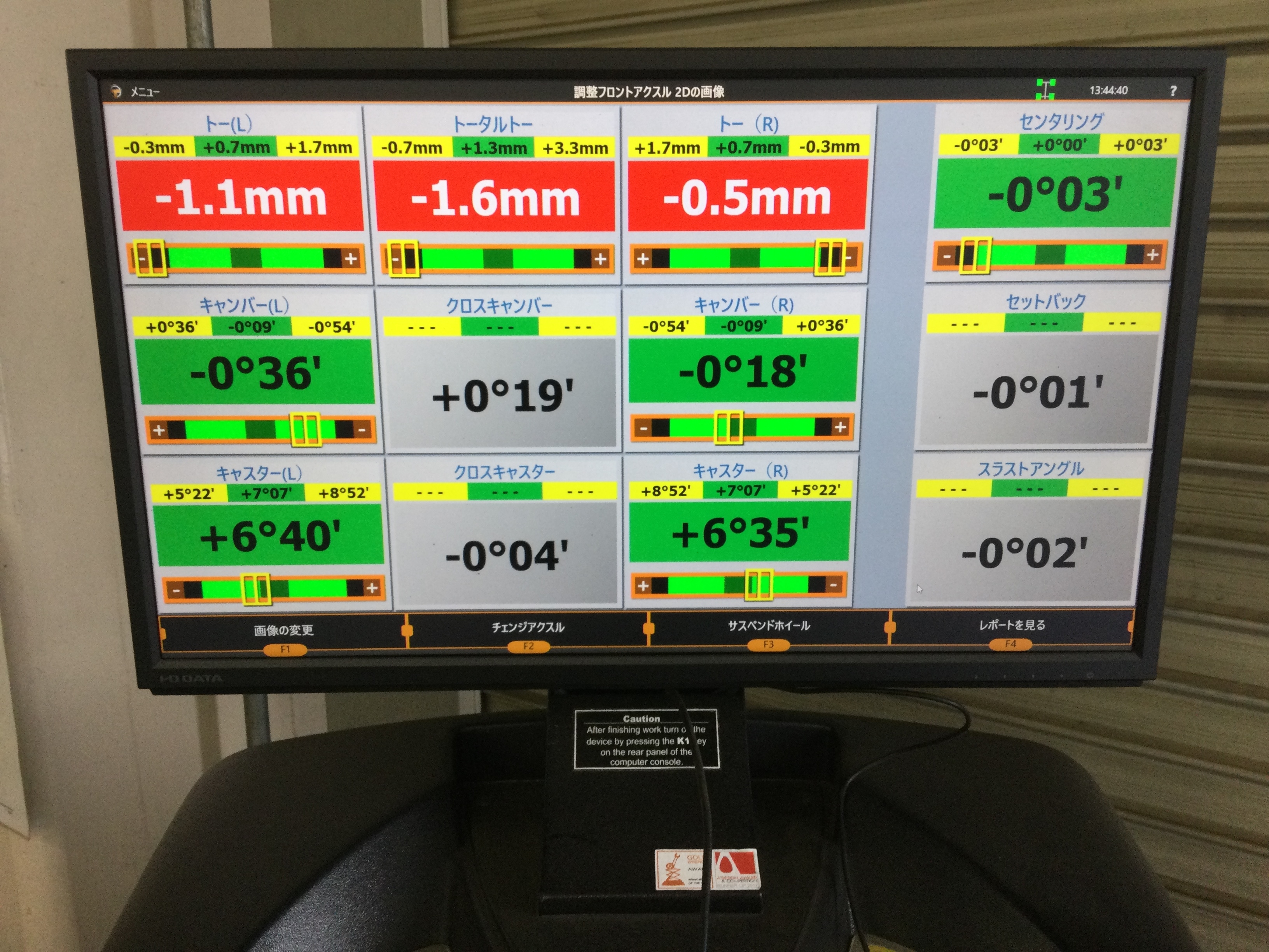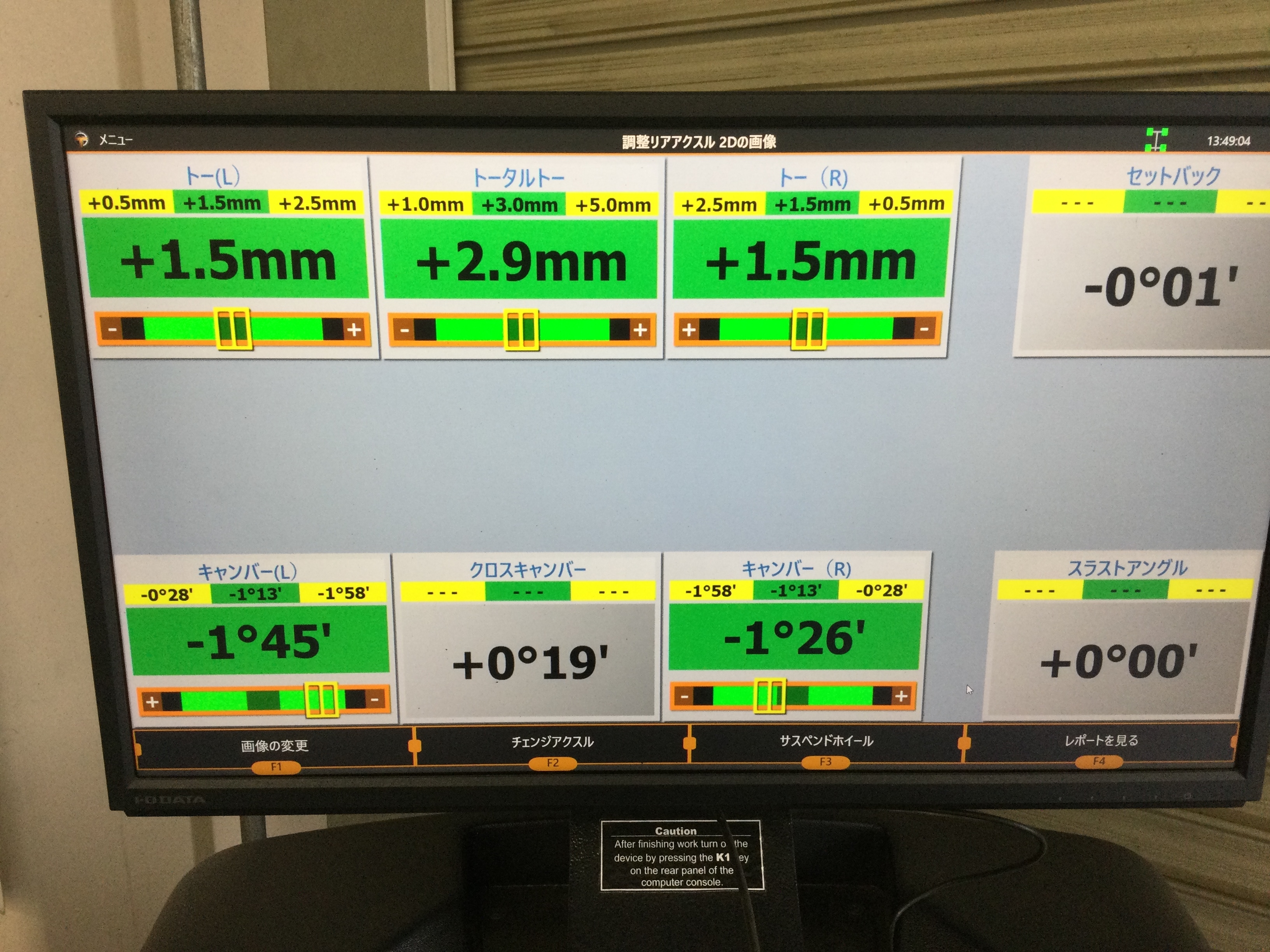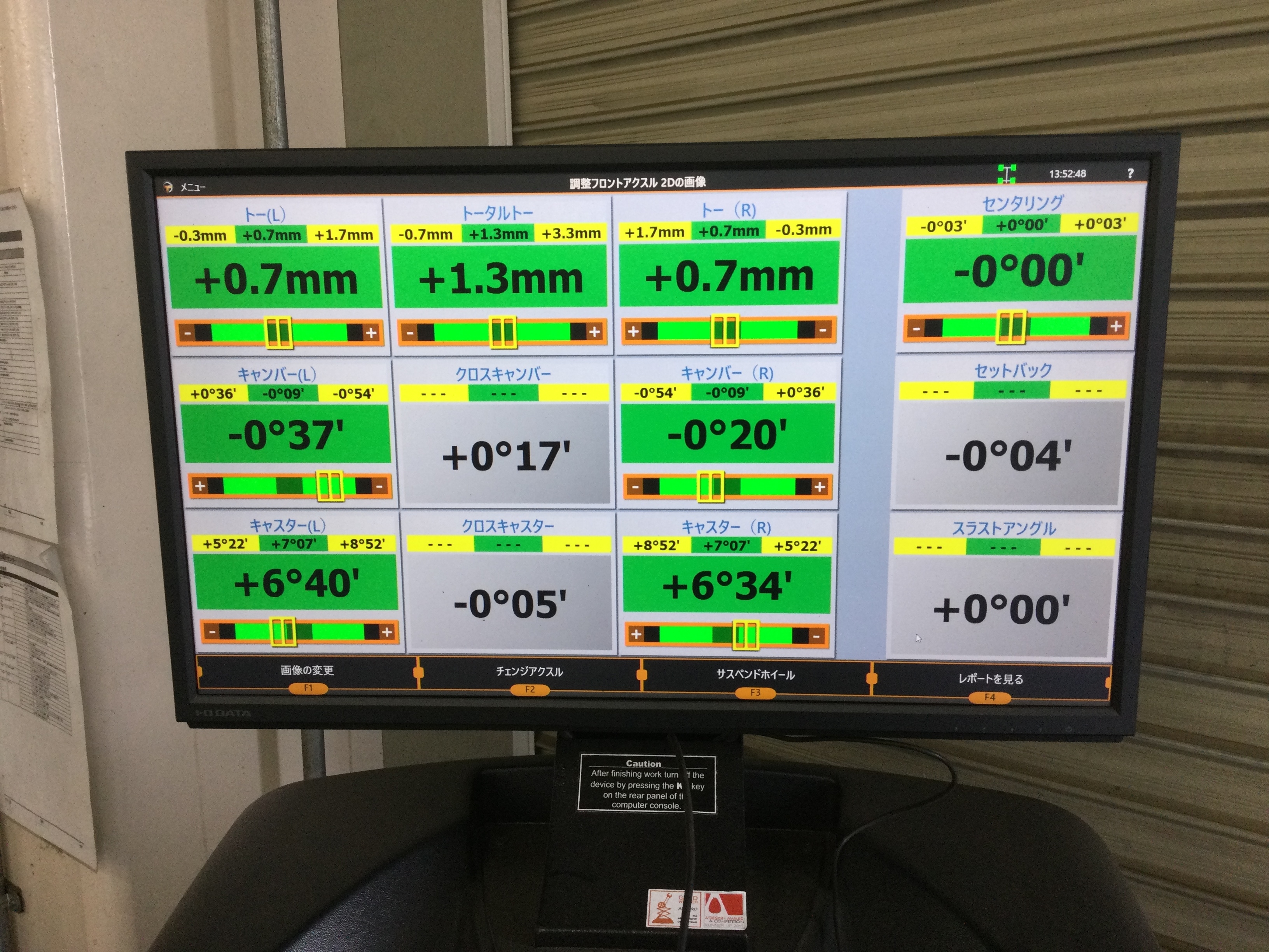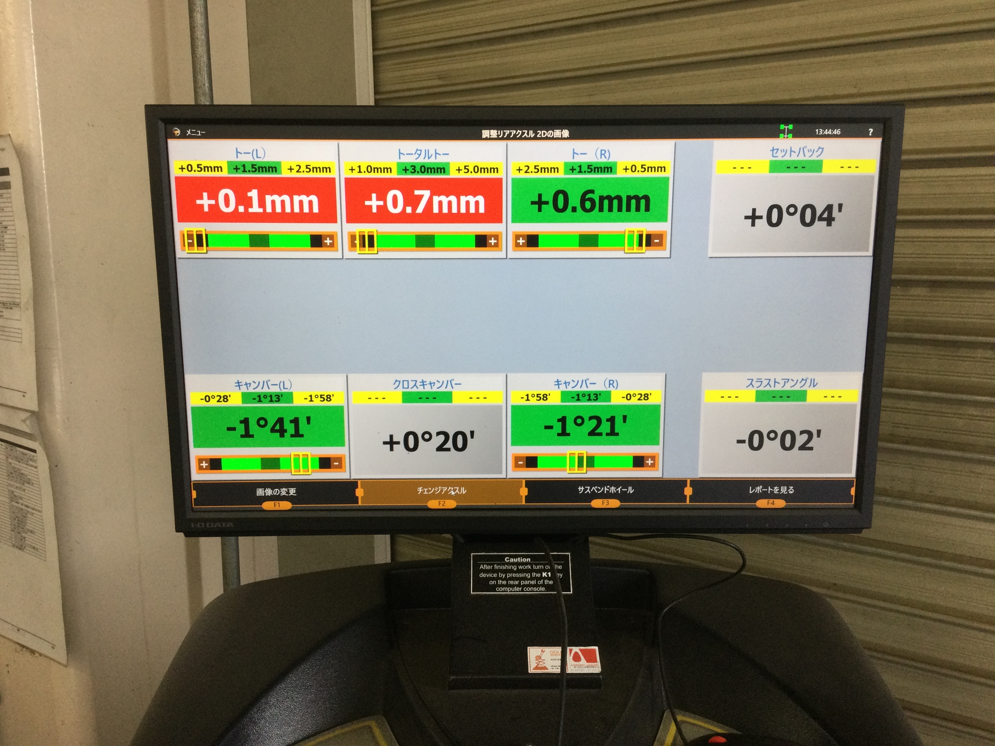 IMG_6513.JPGIMG_6514.JPG調整前の段階では、前側のタイヤ及び後ろ側タイヤが規定値より外開きの状態になっておりましたので、お車の規定値に調整させて頂きました!(^^)!
