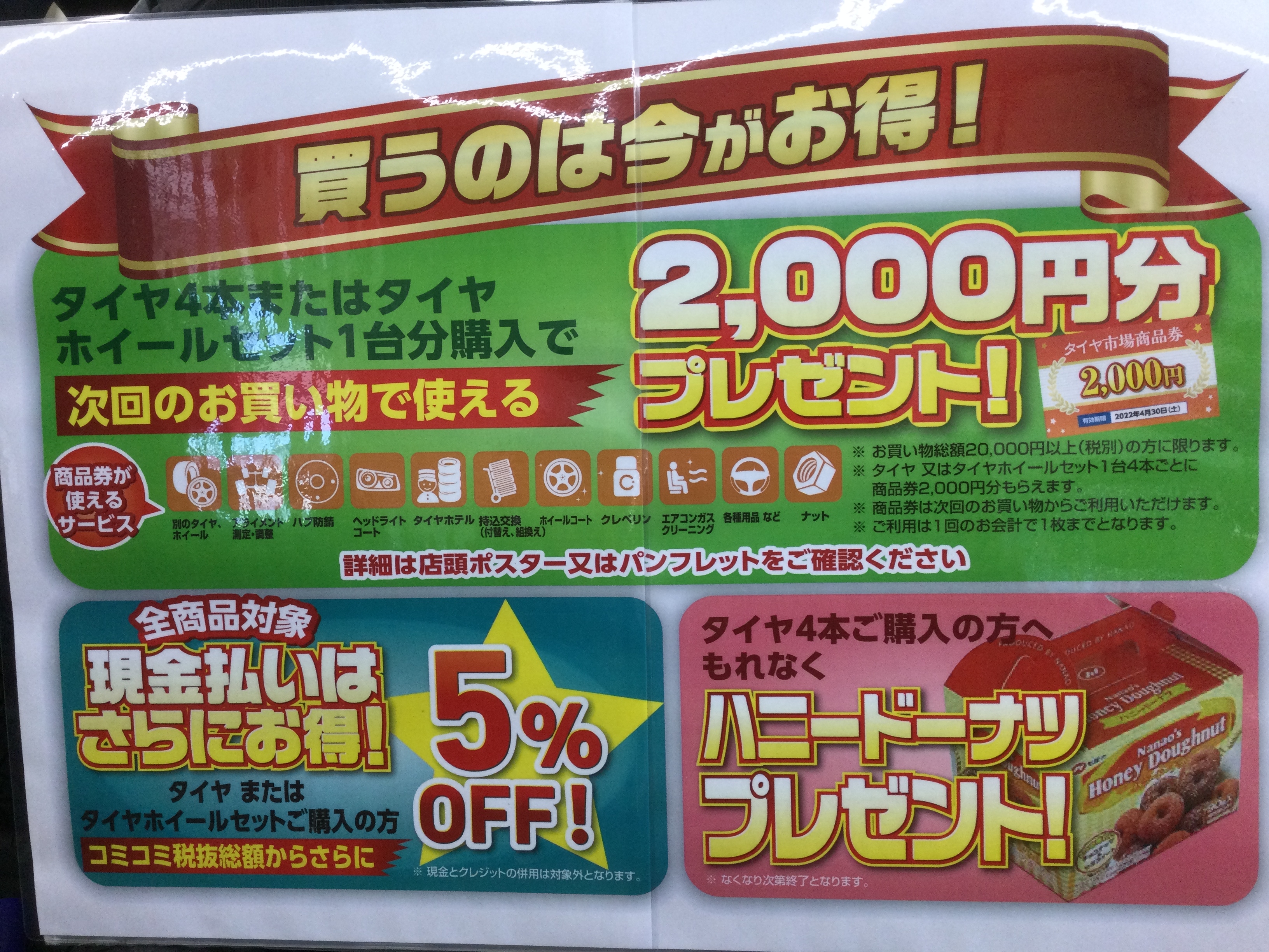特典内容と致しましては、タイヤ4本購入のお客様に漏れなくハニードーナツのプレゼント(商品がなくなり次第終了)、現金での支払いで5%OFF、更には次回の当店ご利用時に使用出来る2,000円分の商品券をプレゼントしております(`・ω・´)ゞ