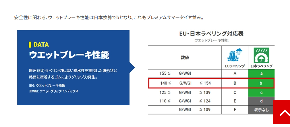 ③安全性に関わる、ウェットブレーキ性能は日本換算でbとなり、これもプレミアムサマータイヤ並み!(^^)!