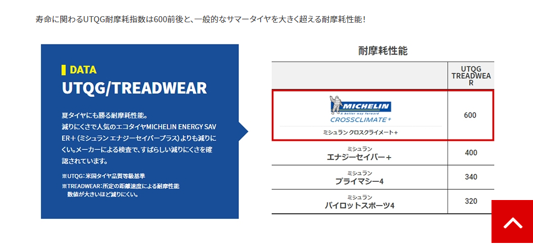 ④寿命に関わるUTQG耐摩耗指数は600前後と、一般的なサマータイヤを大きく超える耐摩耗性能!(^^)!