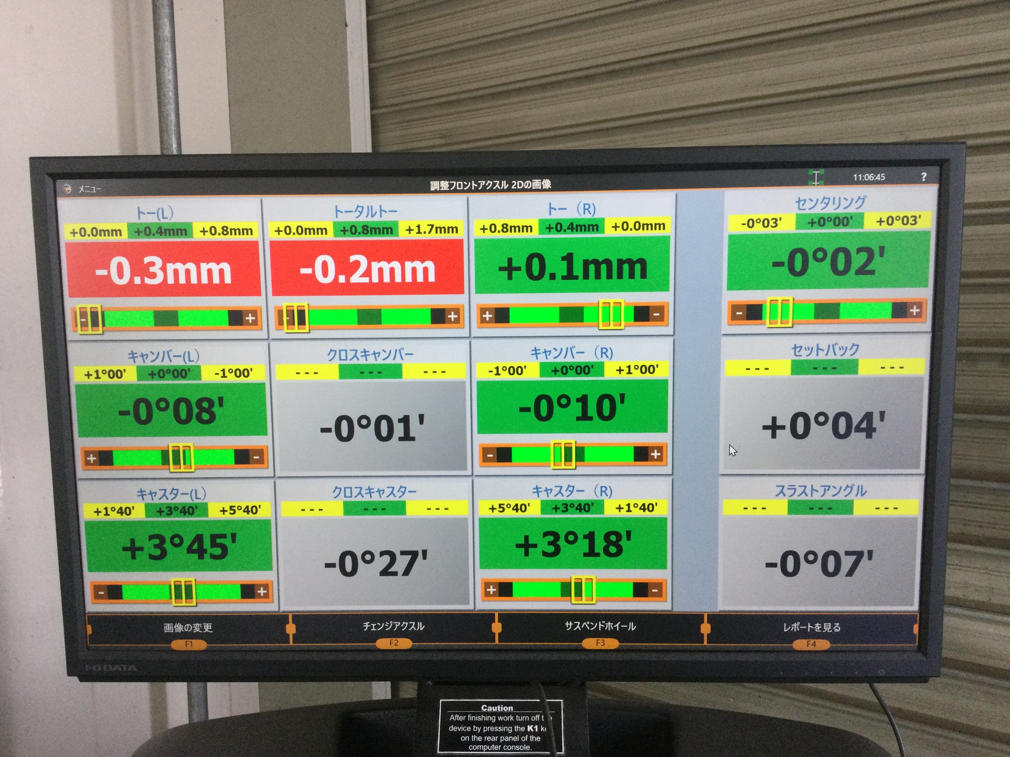 タイヤ交換を頂きましたお客様なのですが古いタイヤが偏摩耗をしていましたので実際に測定をして見ましたところこんな感じで狂っていました(。-`ω-)