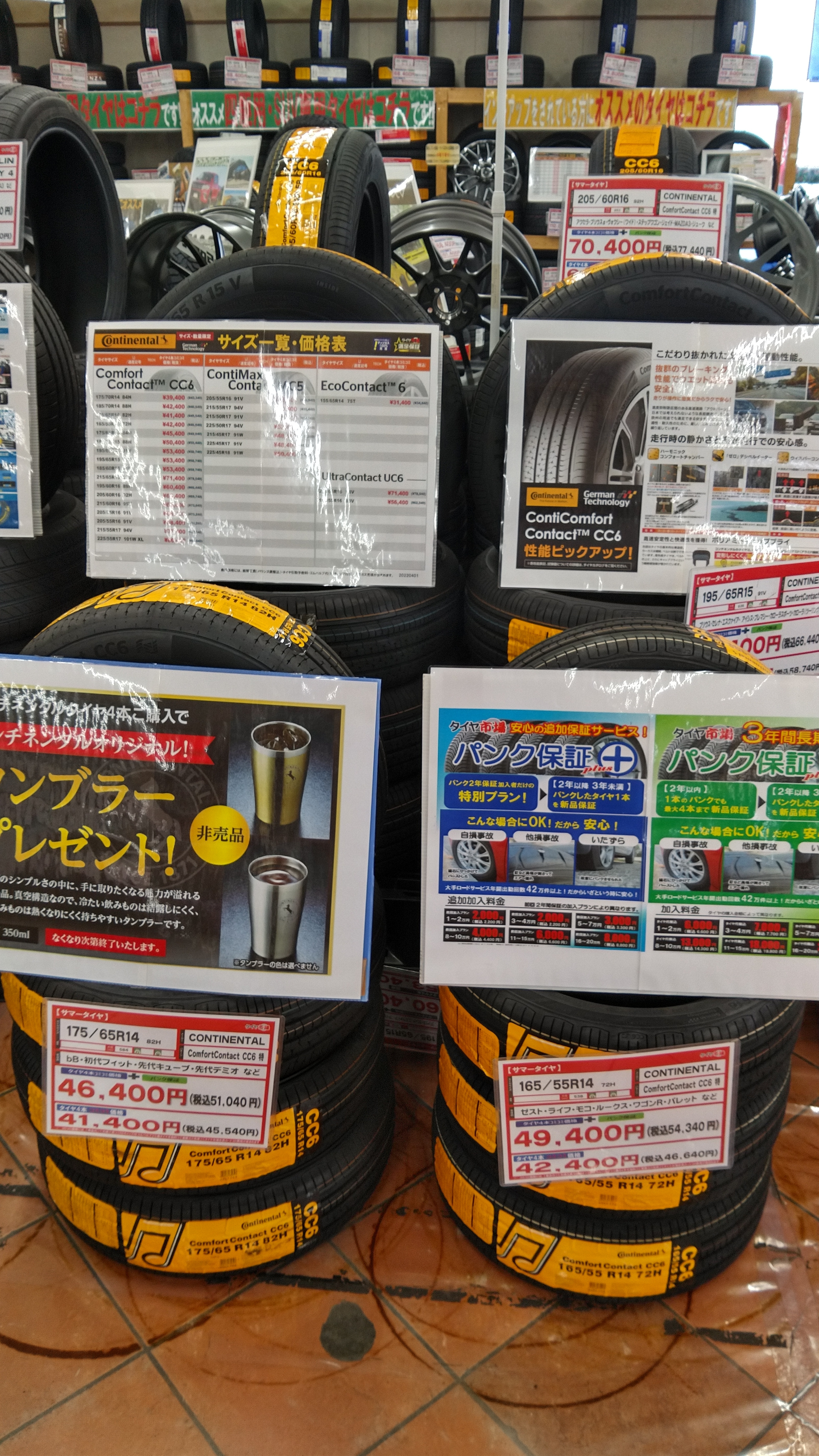タイヤ市場荒牧店では、期間限定の企画を実施しておりまして、内容は欧州での装着率トップクラスを誇るコンチネンタルのタイヤを4本ご購入いただきましたお客様に対して、非売品のタンブラーをプレゼントしております(数に限りが御座います)