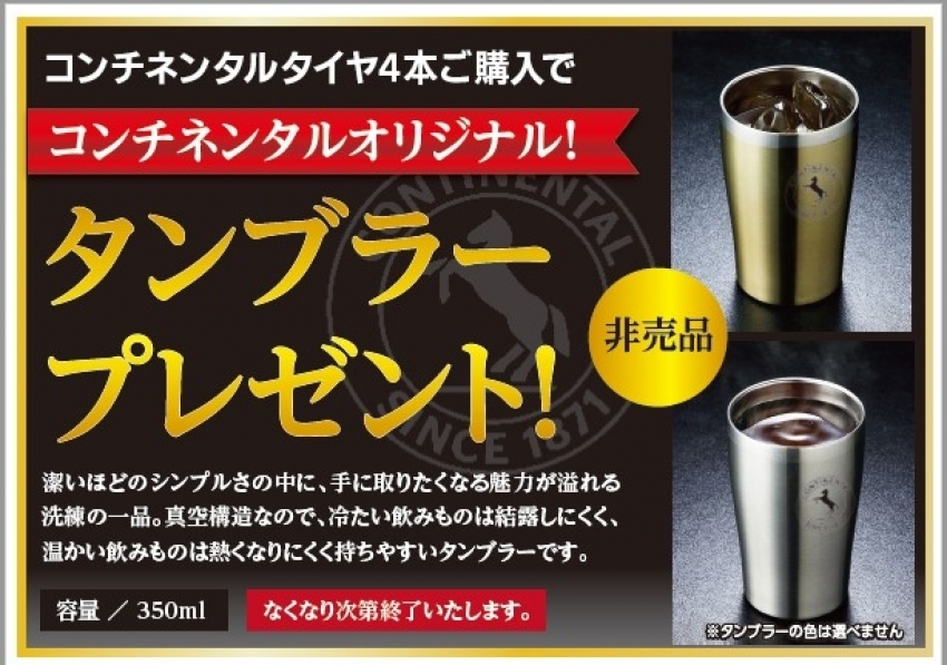 コンチネンタルのタイヤ4本購入で非売品のタンブラープレゼント(^^♪