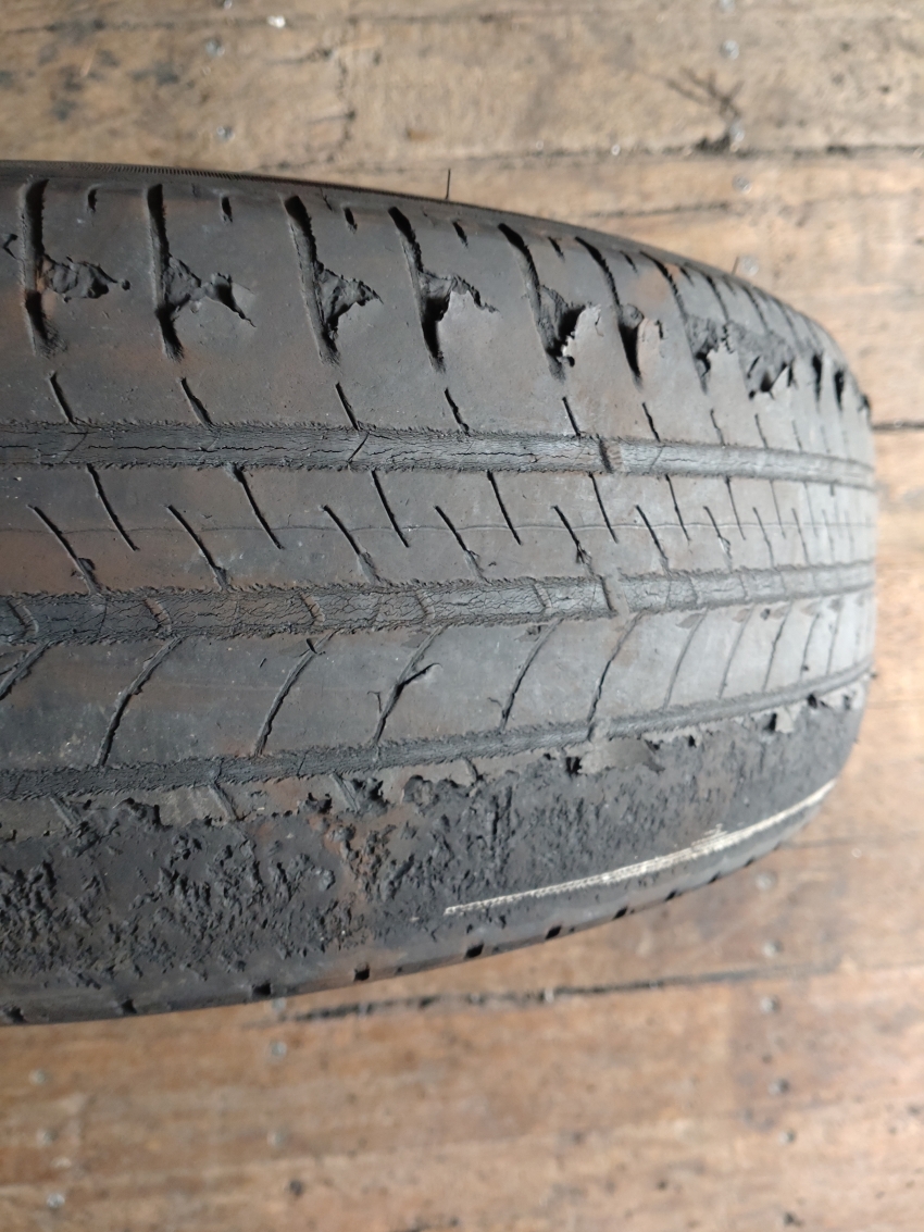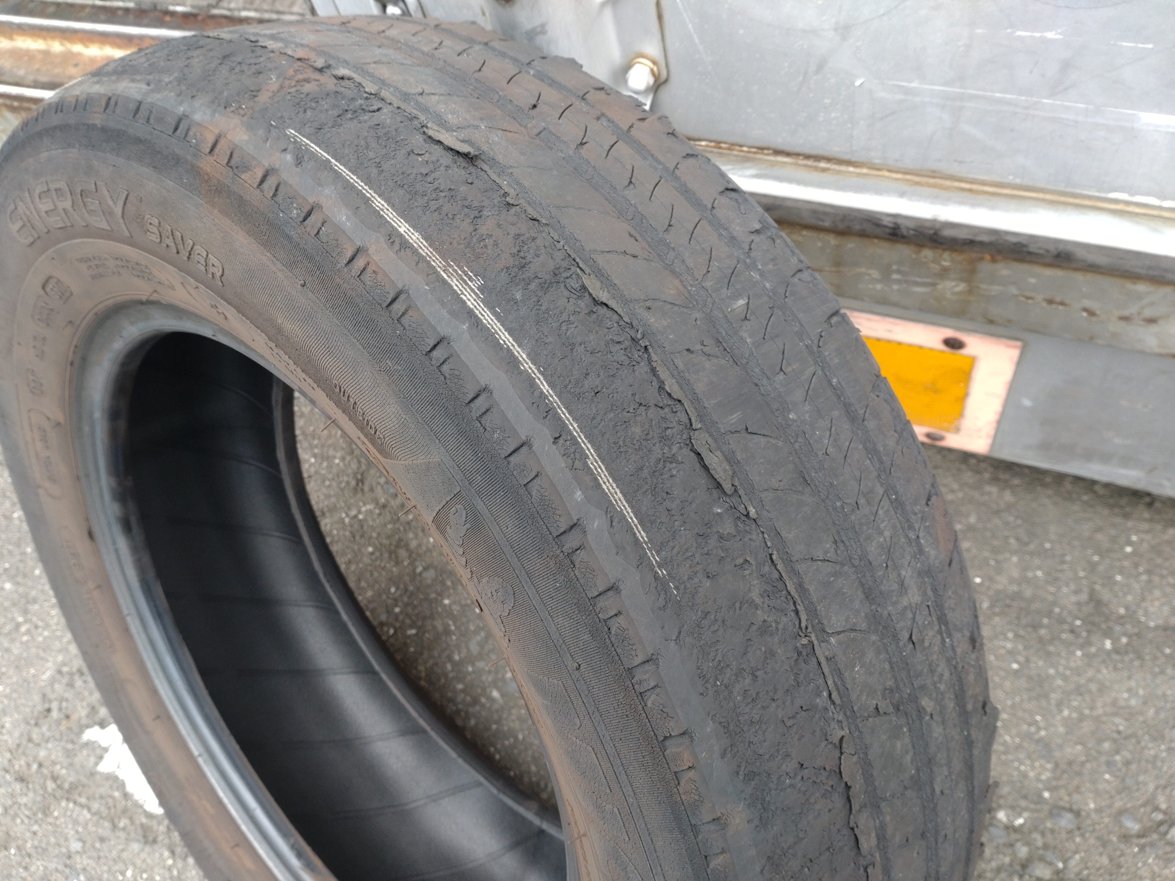 タイヤの溝が無いのはもちろんですがそのうえで皮がめくれそこから下にあるワイヤーが出かけてしまっている状態です...