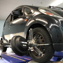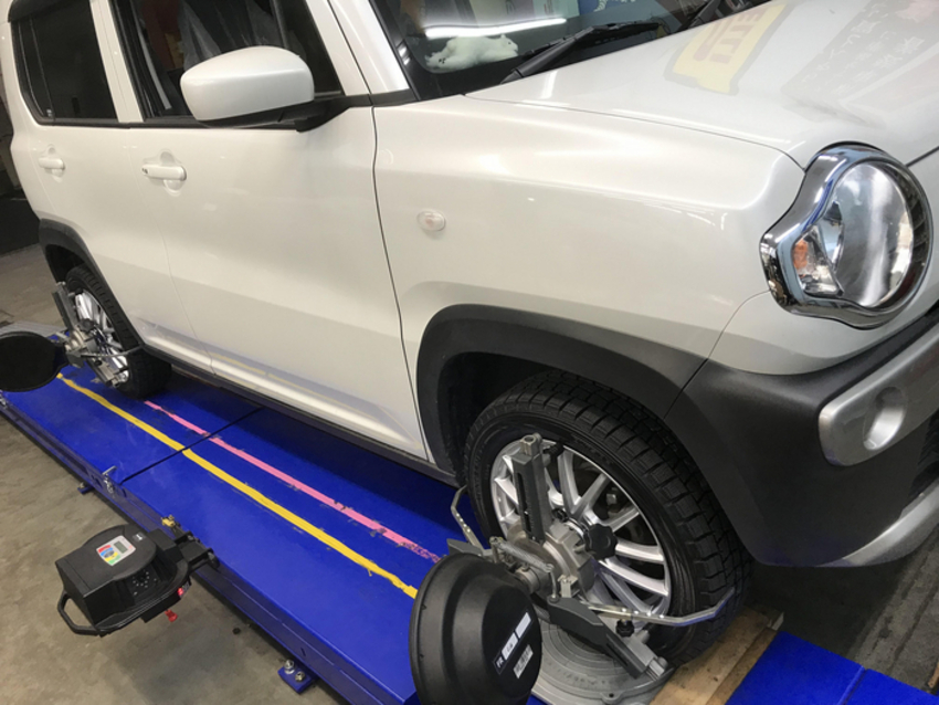 ハスラーのお車で左前のタイヤを縁石に強くぶつけてしまった。との事でアライメント調整をさせて頂きました。