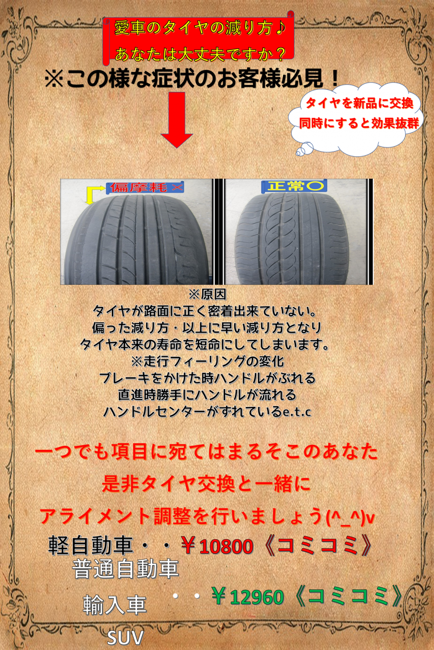 タイヤ本来の性能+寿命UP+操作性能向上=アライメント調整(^_^)v