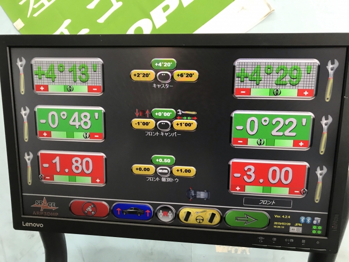 測定結果が出ましたが、、めっちゃ開いてますね(^^;)完全にトーアウト状態、、そんなに大きく車高を変えてないみたいですが、やはり影響は大きいですね