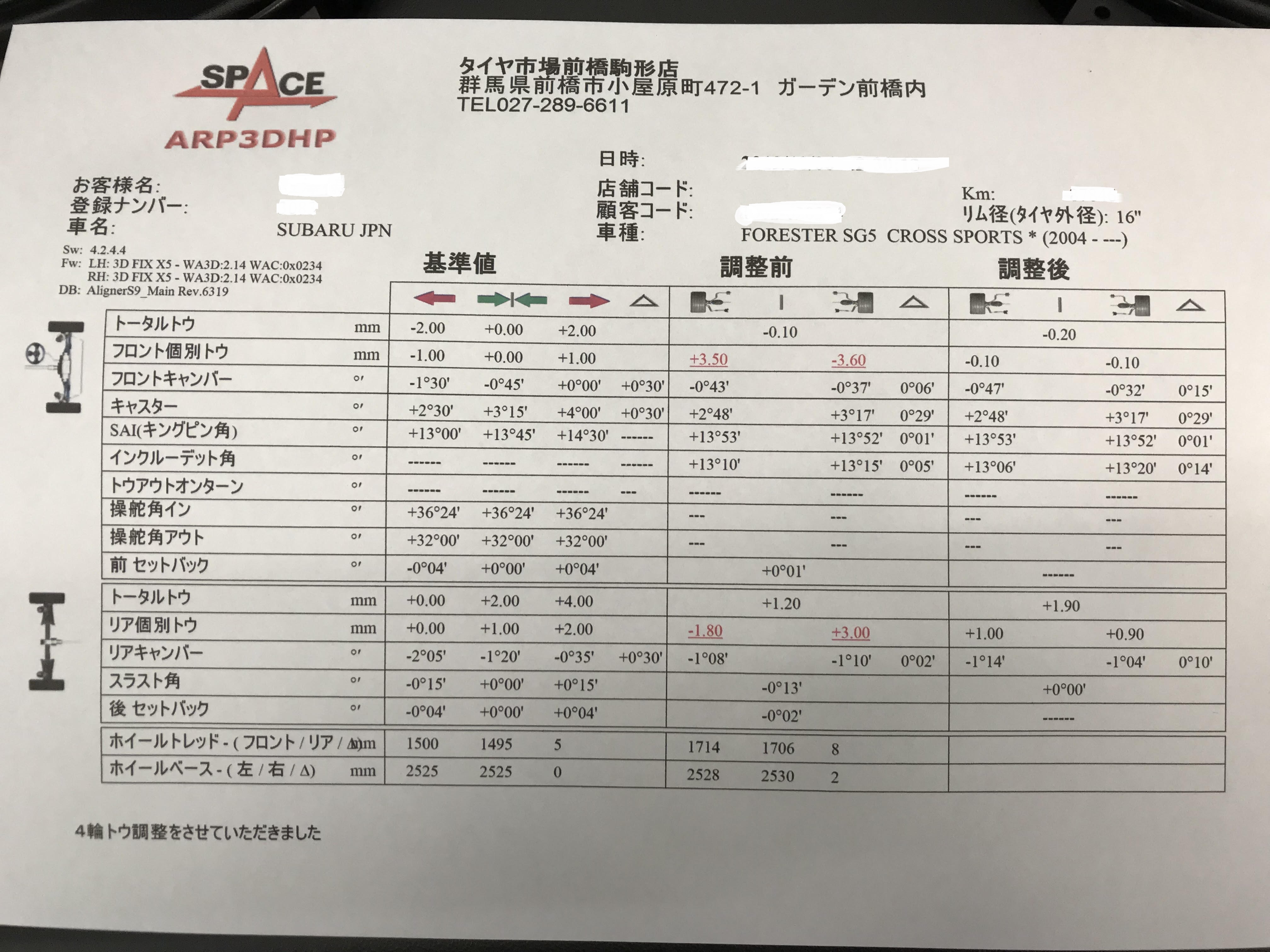 トウは4輪とも大きくズレが出てしまっておりましたが、全てメーカー基準値で調整をさせて頂きました。