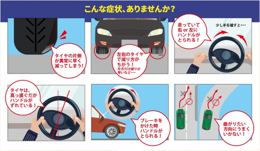ハンドルが左右どちらかに取られたり、タイヤの片べりが激しかったり等・・・
