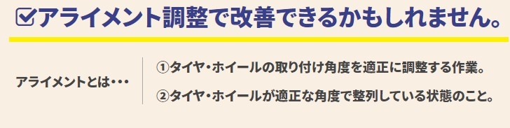 これはアライメントがズレている恐れがあります!また、縁石に乗り上げたり、車をこすったり等、強い衝撃が加わると角度はズレてしまいます!