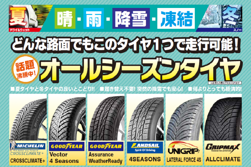 ※オールシーズンタイヤとは夏タイヤ(ノーマルタイヤ)と冬タイヤ(スタッドレスタイヤ)が