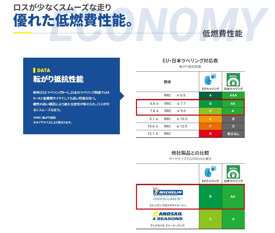 日本のラベリング制度ではAA~Aに該当し、低燃費タイヤとしても高い性能を持っています!