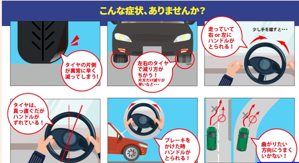 タイヤが偏摩耗してしまったり、ハンドルのセンターがずれてしまっていたり等!
