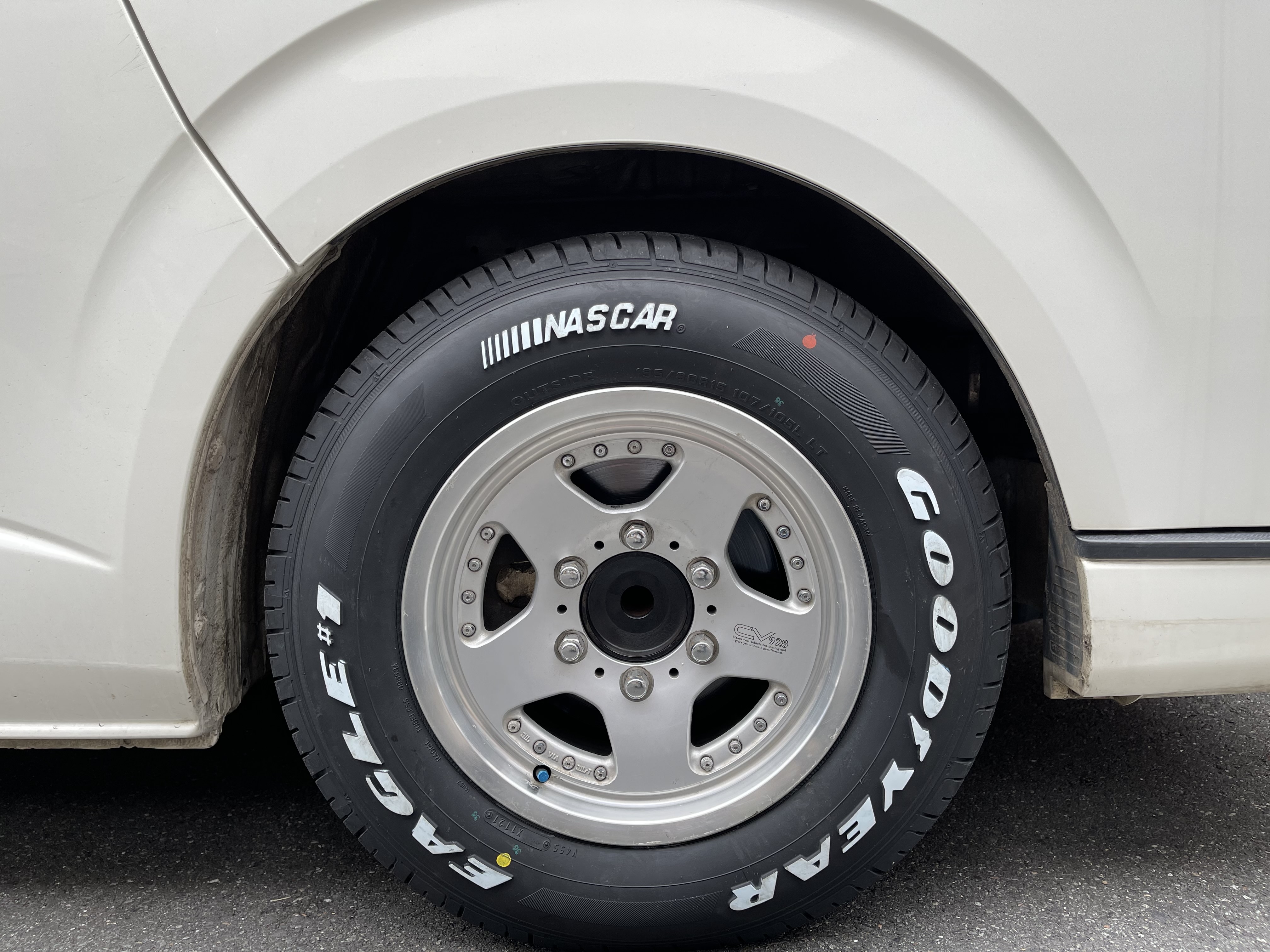 今回はハイエースにホワイトレタータイヤを装着しました!