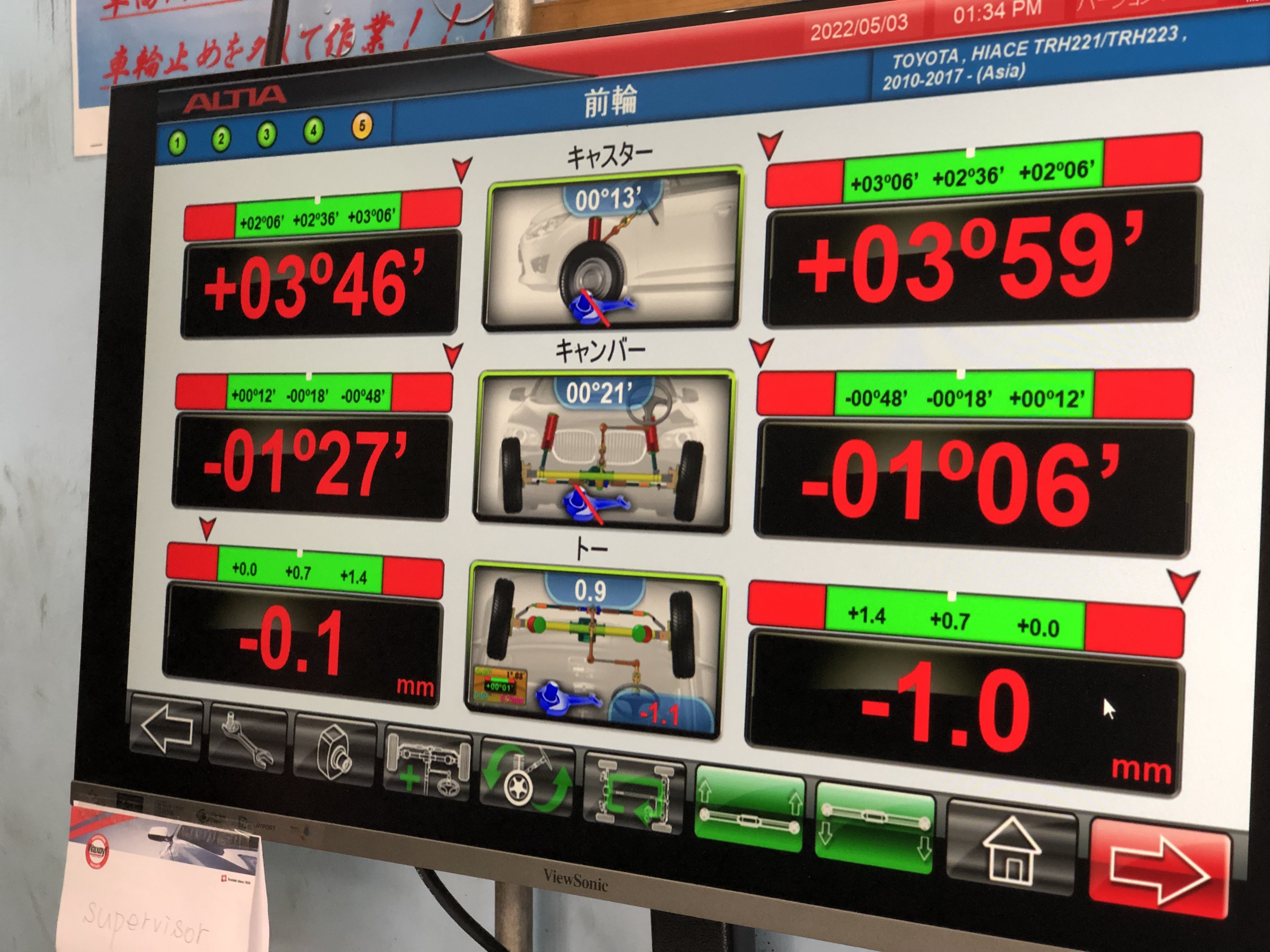 ハイエースは・トー角・キャンバー・キャスターと調整箇所がたくさん・・・