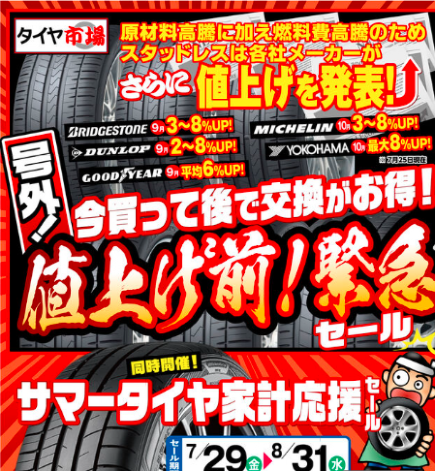 各社タイヤメーカー様燃料高騰の為!値上げ発表!!!