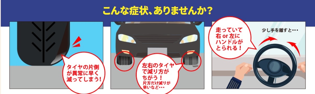 Cut2024_0326_1242_06.jpgこのようにタイヤが片べりをおこしていたり、ハンドルが右、左にハンドルがとられてしまうという症状がある車両はおそらくアライメントがズレてしまっています(;´・ω・)